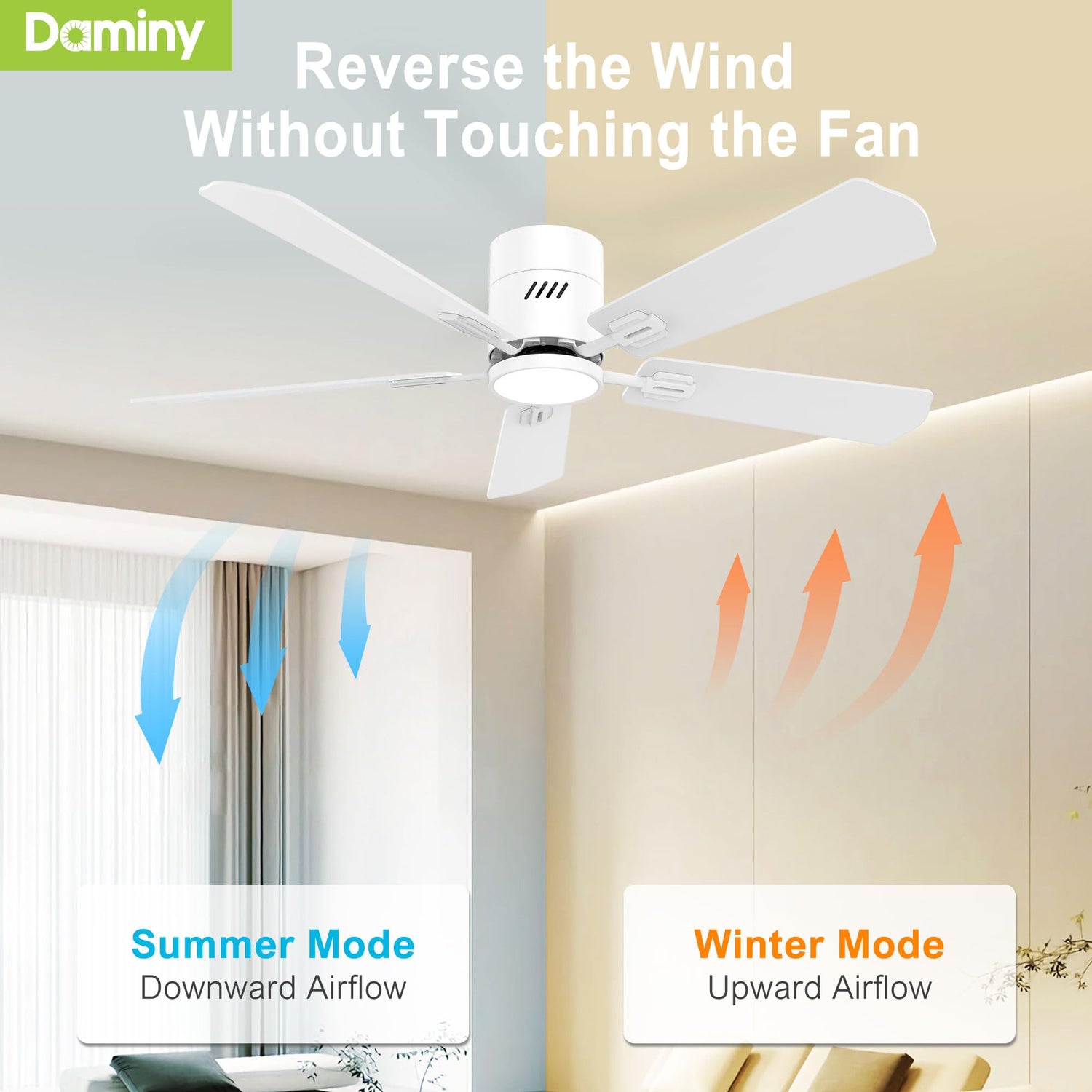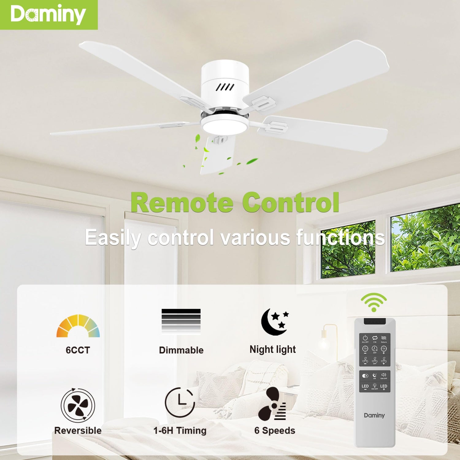 DAMINY 52 inch 5 Blades White Ceiling Fans with Lights,Flush Mount,6CCT, Low Profile Ceiling Fan with Light and Remote Control,DC Motor,Ceiling Fan for Bedroom, Kitchen,Living Room,Indoor/Outdoor Use