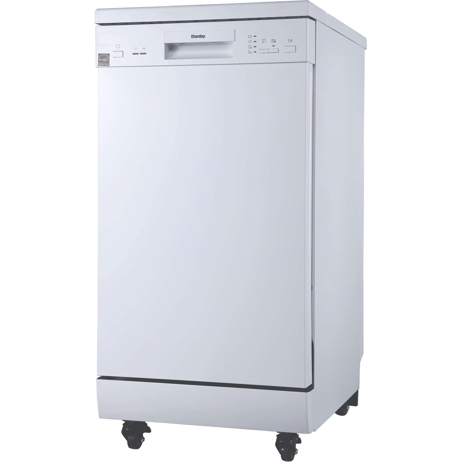 - Washing dishes has never been as much fun as it is with this versatile dishwasher by Danby. This attractive machine comes with a silverware basket, an eight place settings capacity and four different wash cycles. It’s just 18 inches wide (45.7 cm) meaning it can easily be installed in condos and apartments and the convenient built-in castors allow you to move it around with ease. Your electricity bills won’t take a beating with this smart and eco-friendly unit as it boasts a valuable low-water consumption function and is also Energy Star rated. The appliance features a durable stainless-steel spray arm and interior making it the ideal dishwasher for remote cottage locations.
