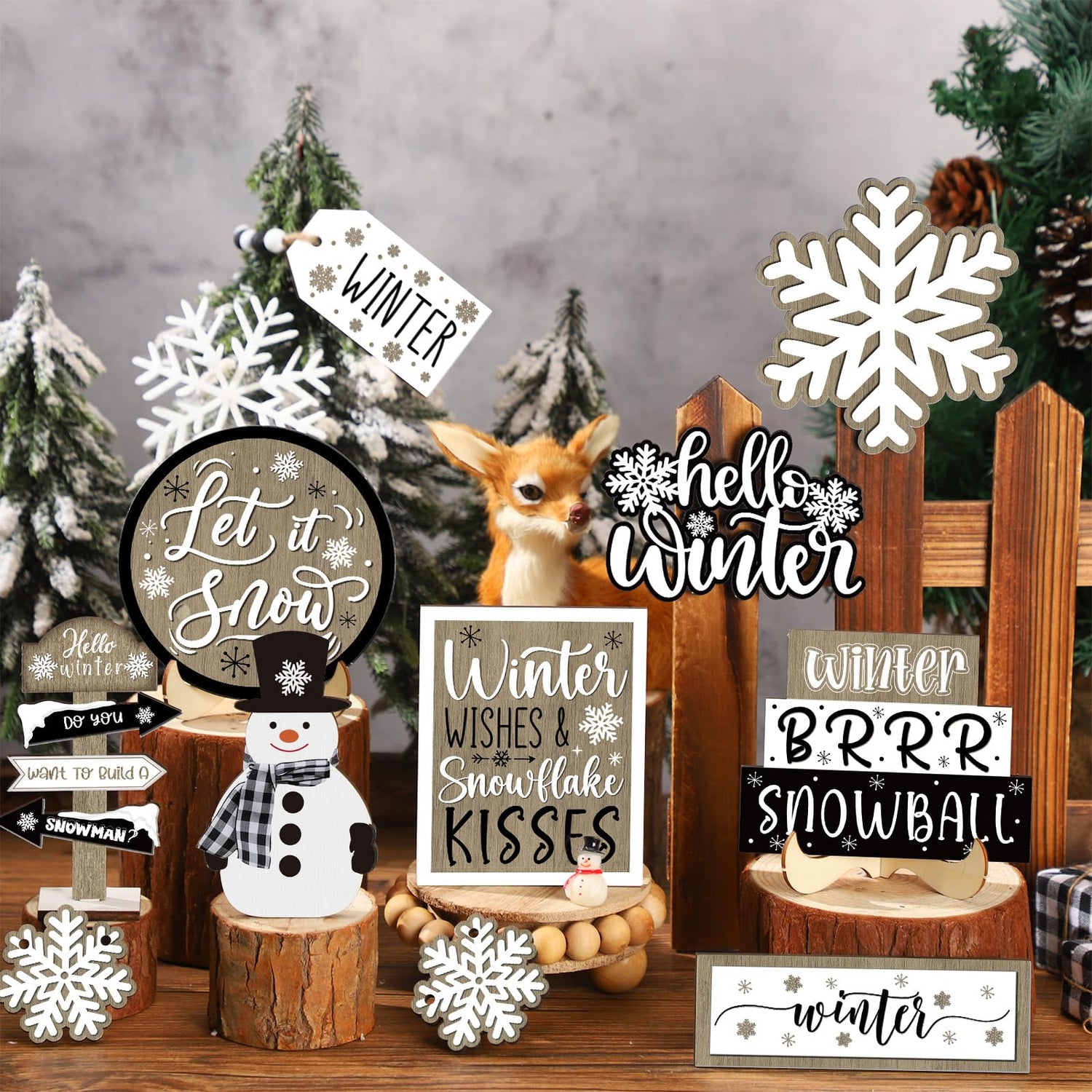 Dandat 15 Pcs Christmas Tiered Tray Decor Winter Tiered Tray Decorations Set Hello Winter Let It Snow Snowman Snowflake Wooden Signs Farmhouse Table Centerpieces for Home Table Shelf
