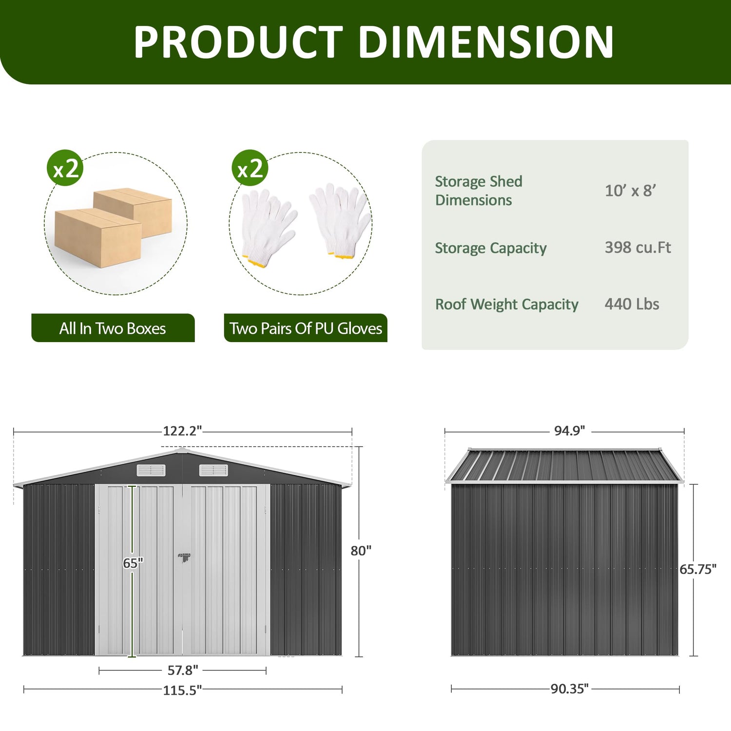 - 【Ample and Organized Storage Area】: Our shed provides expansive storage, neatly accommodating your tools and outdoor essentials. Spanning dimensions of 115.6"D x 122.2"W x 80"H. We are committed to providing you with the most cost-effective outdoor shed option