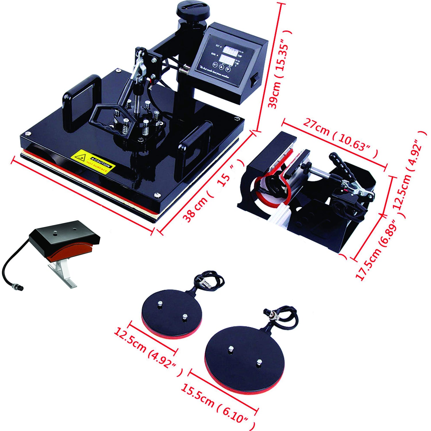 Versatile operation - Five separate heating elements allow transfers onto a variety of items, such as T-shirts, mouse pads, plates, coffee mugs, ball caps, phone cases, license plates, and many other items.