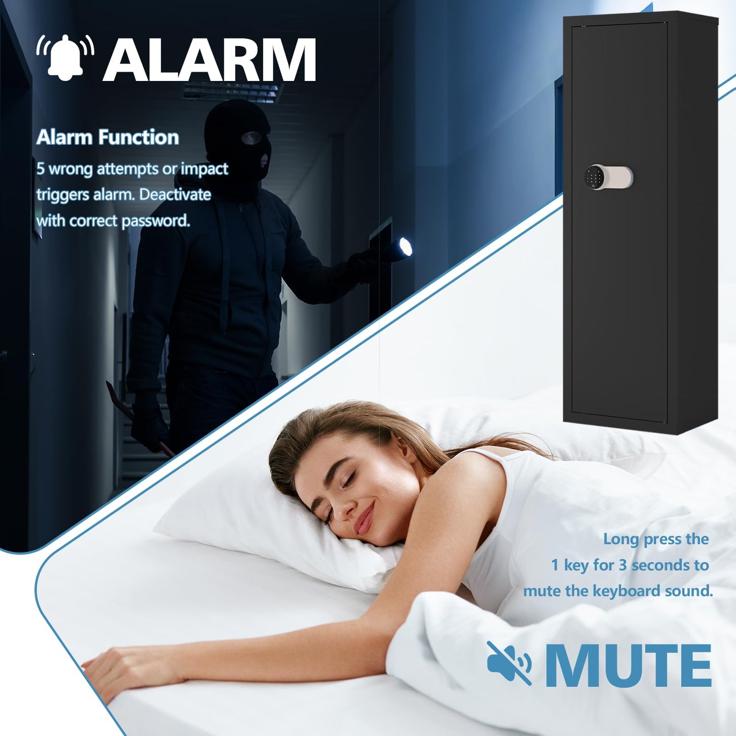 - 【Customizable Mute and Alarm Modes】Tailor the security of your gun safe with mute and alarm functions. Toggle between silent and non-silent modes with a simple long press of “1”, and if an incorrect code is entered 5 times, an alarm will sound. The built-in LED light ensures quick and safe access to your firearms, even in the dar