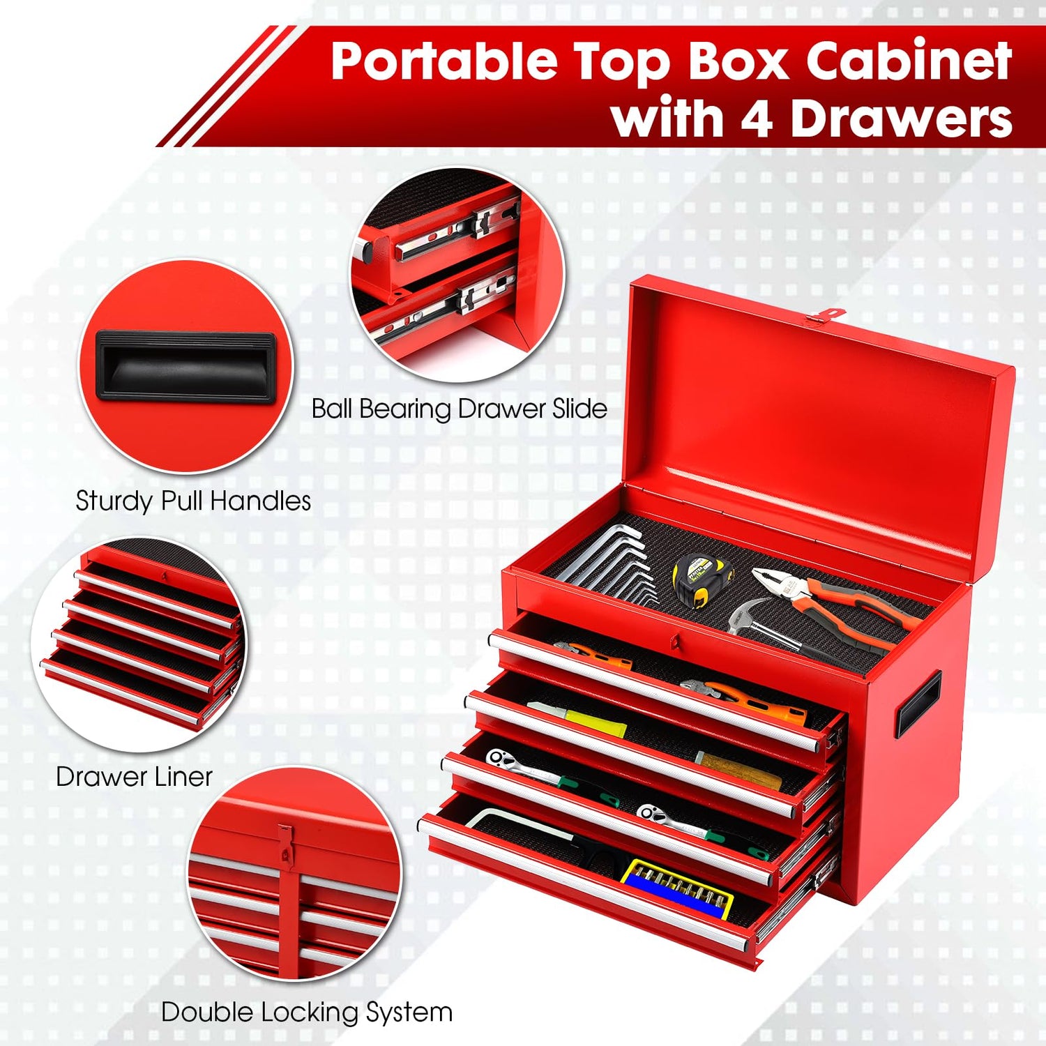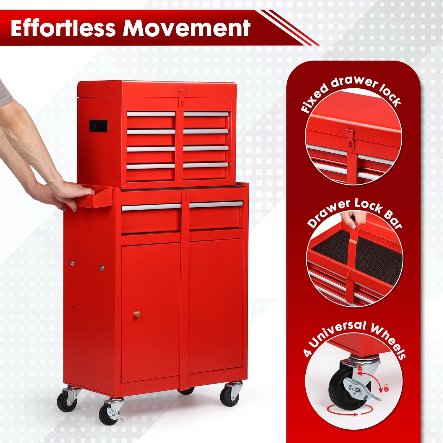 - 【Organized and Accessible】This tool chest features a layered design, consisting of a 4-drawer tool box and a rolling cabinet that can be used separately or together according to your needs. Additionally, the top toolbox can be stored inside the bottom cabinet to save space.