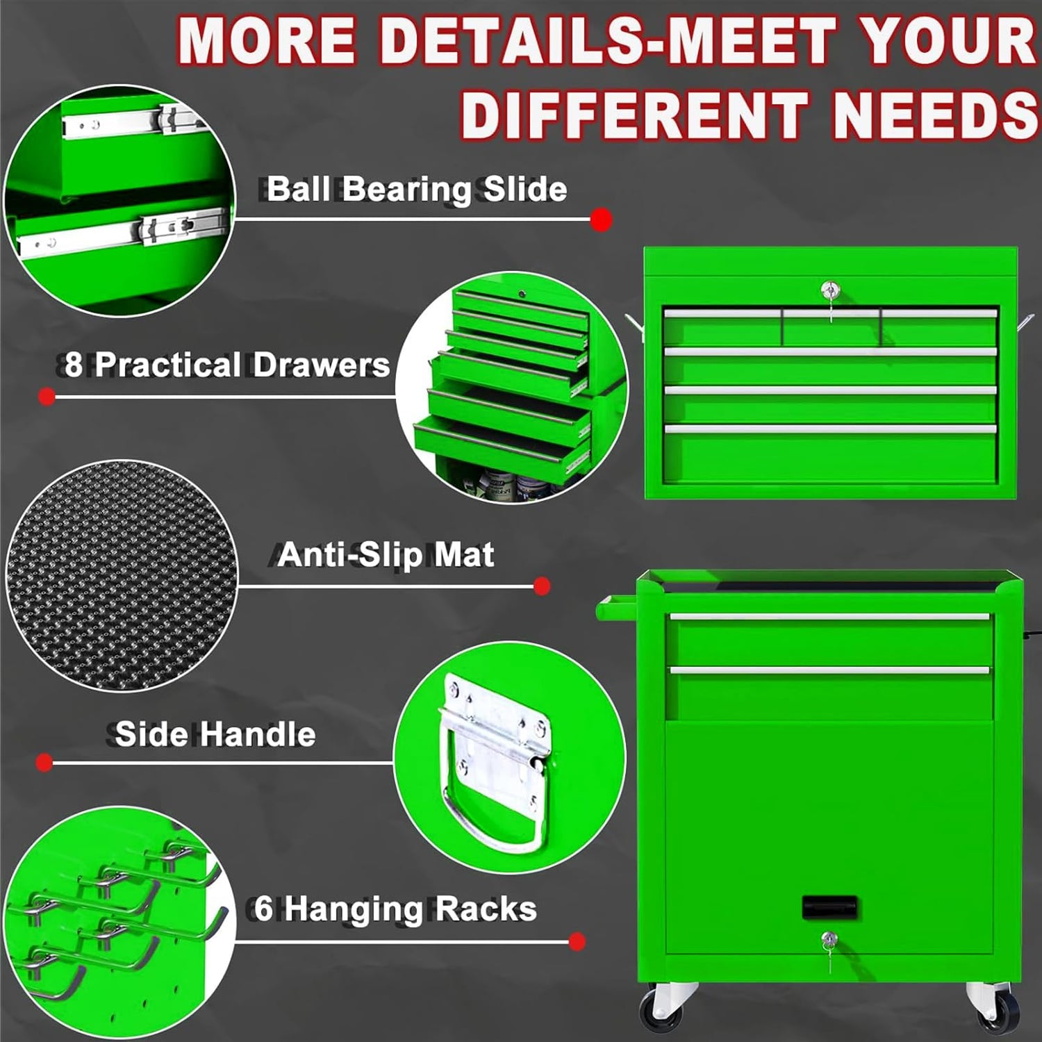 Dawmilon 8-Drawer Rolling Tool Chest, 2-in-1 Tool Box Organizer with Lockable Wheels, Sliding Drawers, and Detachable Top, Garage Workshop Tool Storage Cabinet, Green