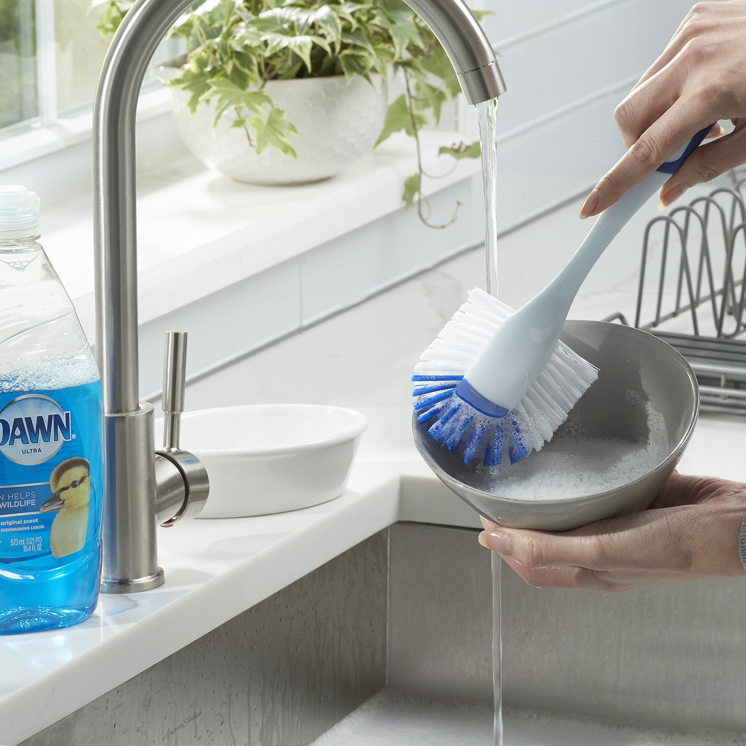 Details: The Dawn Radial Kitchen Brush is outstanding for cleaning rounded surfaces. Contoured non-slip comfort grip is ergonomically designed. Nylon radial bristles will keep shape in hot water. The unique raised scrubber brush assists with baked on messes. Safe on non-stick surfaces and can be used on dishes and glasses.