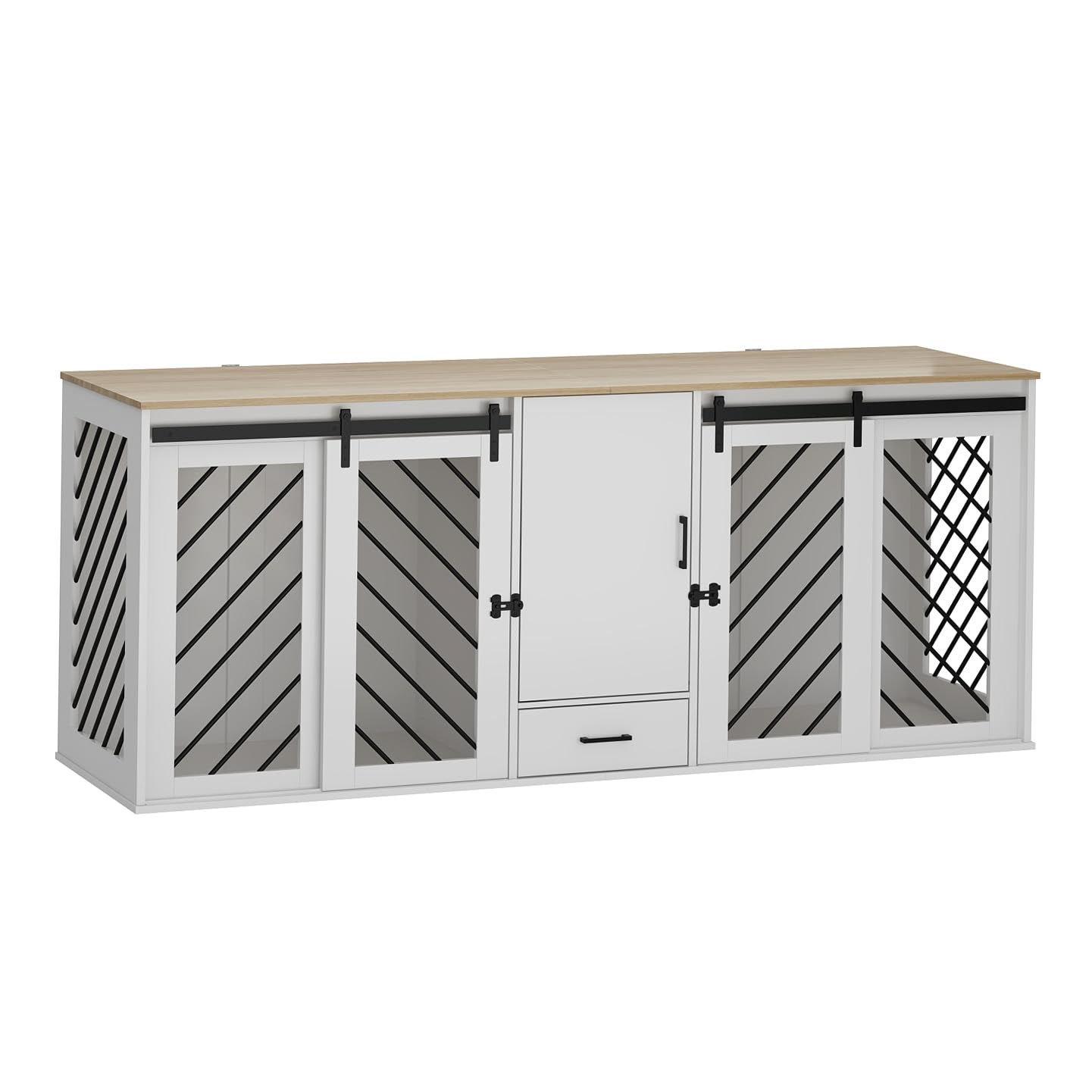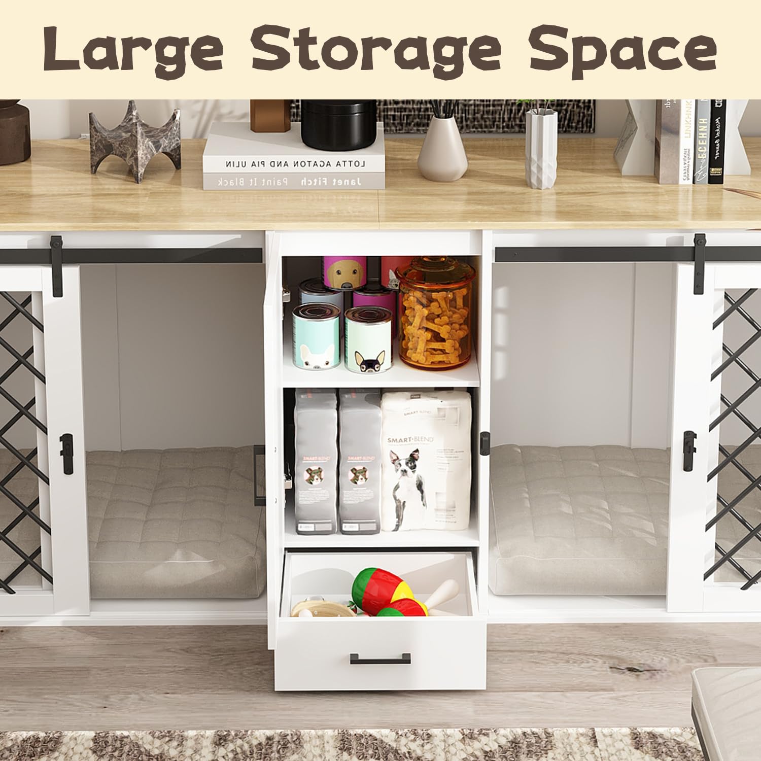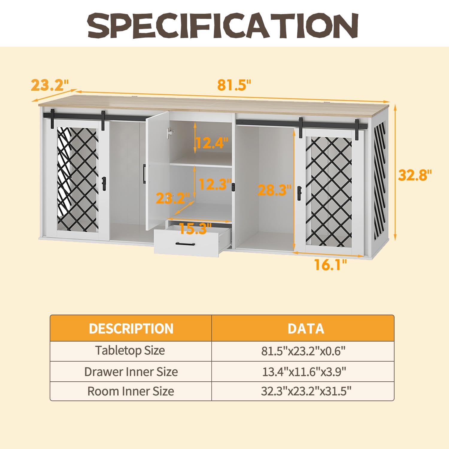 DAWNSPACES Furniture Dog Crate,81.5" Heavy Duty Wooden Dog Cage Kennel with a Storage Drawer, Shelves,Sliding Doors,Indoor Furniture Style Dog Crate Table,Dog House for Medium Dogs,White