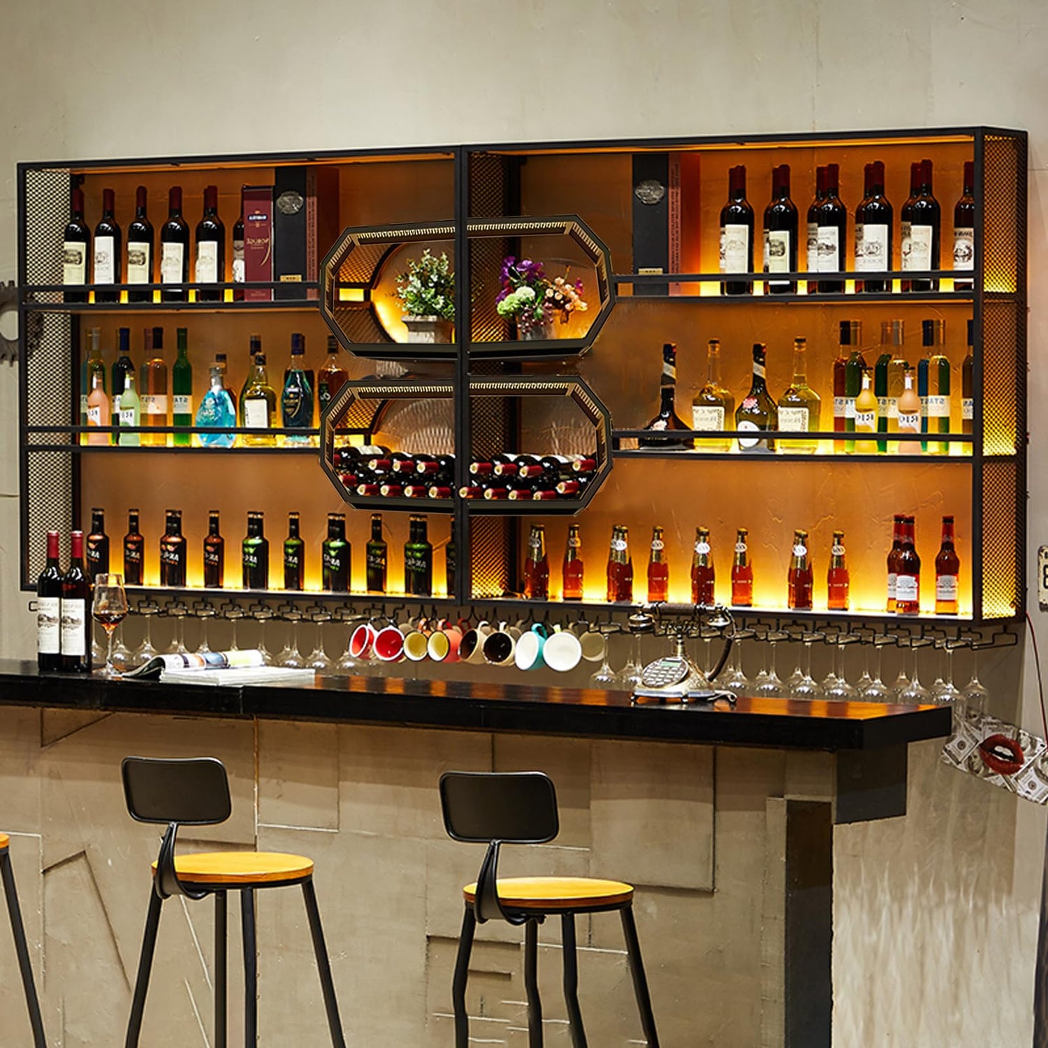- EXTRA LARGE CAPACITY - The wine bar shelf adopts a 3 layer wine bottle storage and wine glass holder design, which can store wine bottles, flowerpot, decoration. There is a separate arc-shaped area in the middle, which can be stacked to hold many wine bottles for easy access. Bottom has wine glass rack, can hang Bordeaux glasses, champagne glasses, cocktail glasses etc.