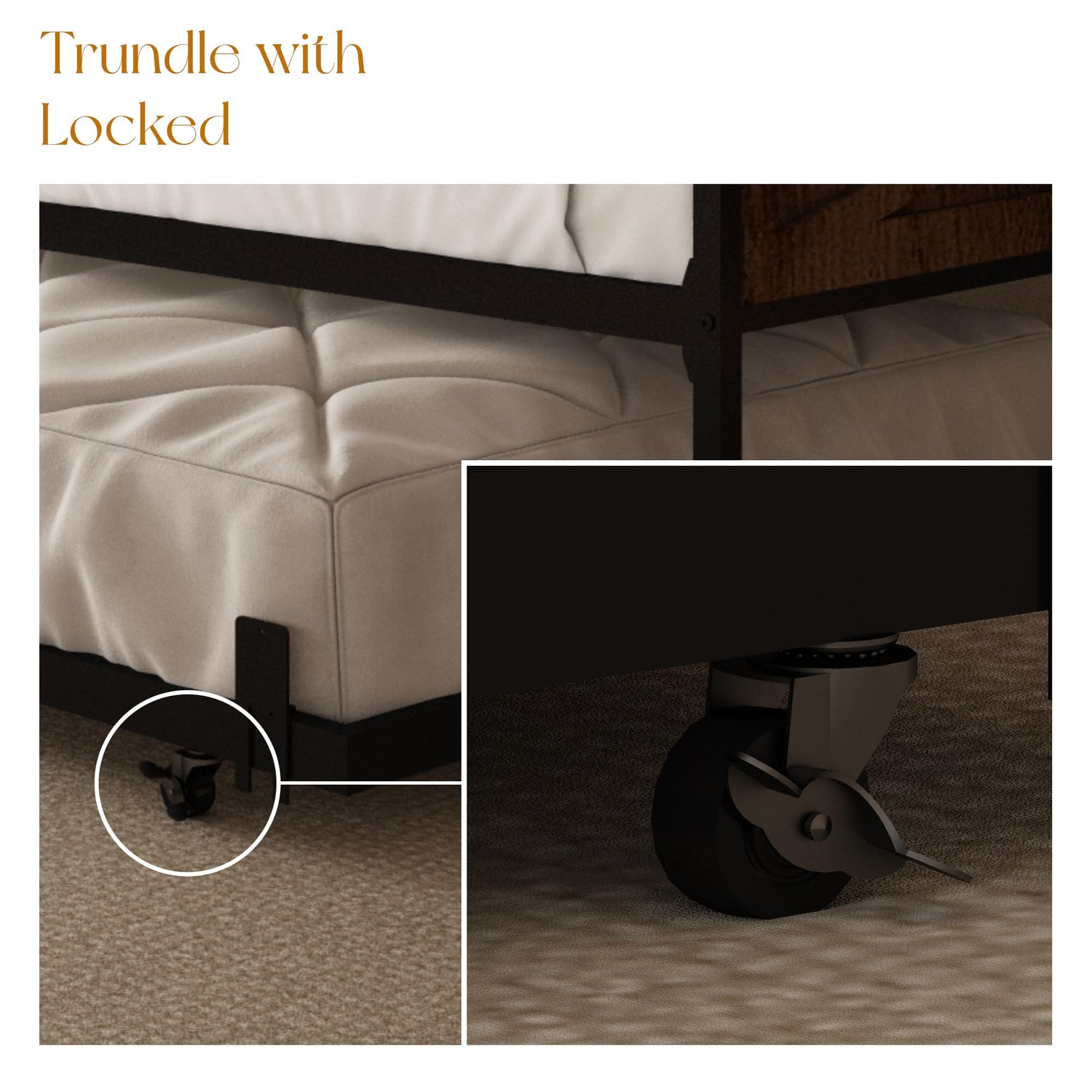 - 🏠 Durable and Stable Structure:The trundle bed twin frame is crafted from heavy duty metal for exceptional durability and support, bed frame and trundle holding up to 400 lbs. Its embeded design prevents the mattress from sliding, ensuring stability while you sleep. The curved armrests not only add elegance to the overall design but also enhance comfort and safety. Every element guarantees long-lasting support and a pleasant seating and sleeping experience.