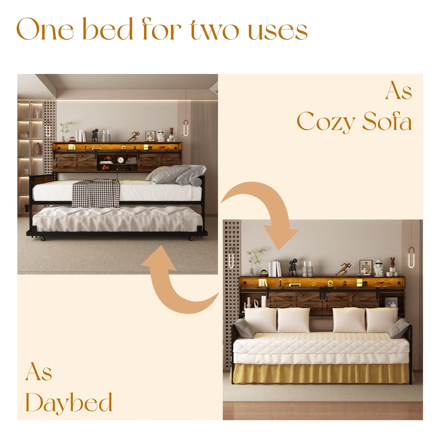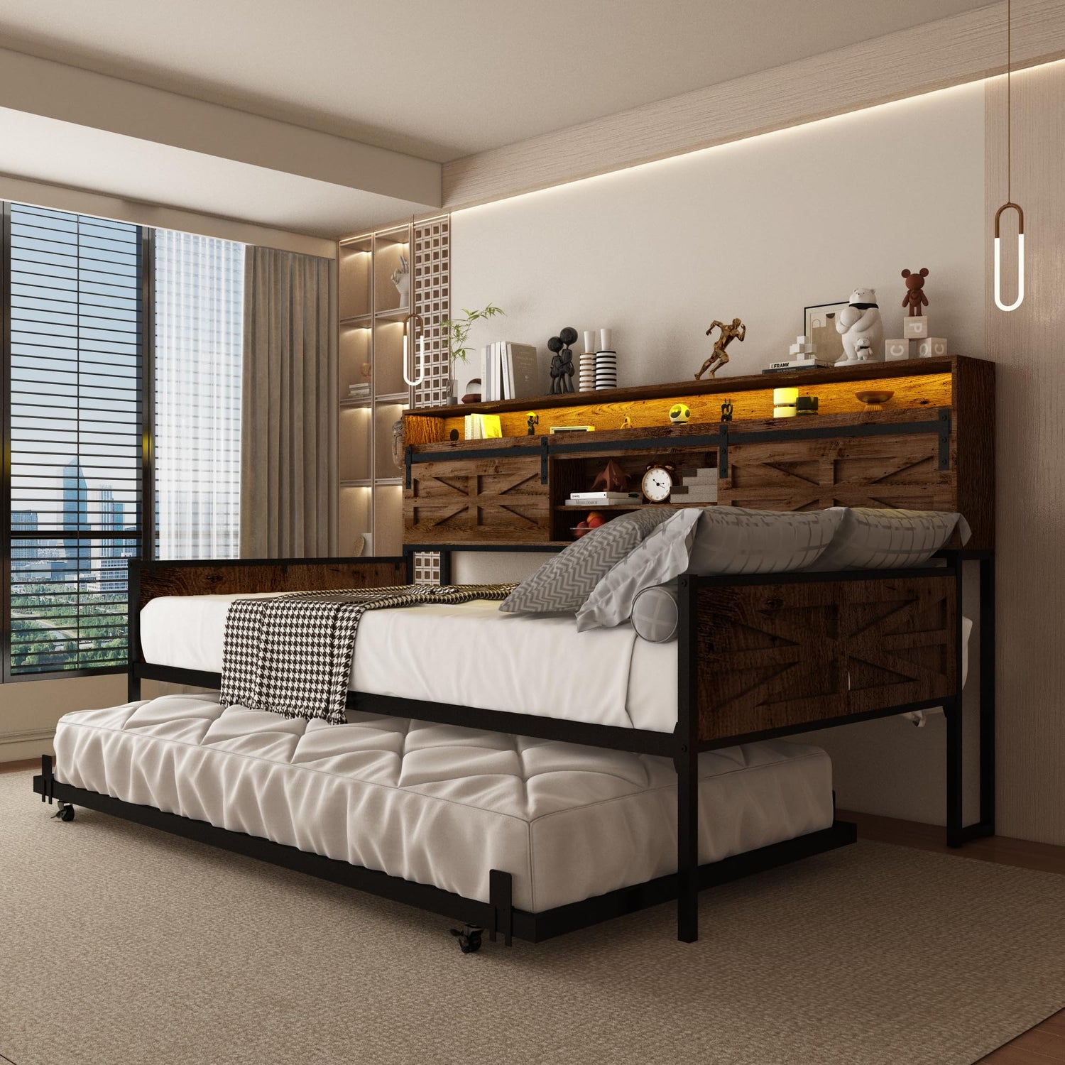 Daybed with Trundle and LED Light, Farmhouse Twin Daybed Frame with Storage Headboard & Charging Station, Heavy Duty Metal Day Bed with Sliding Barn Door for Living Room,Bedroom (Rustic Brown, Twin)