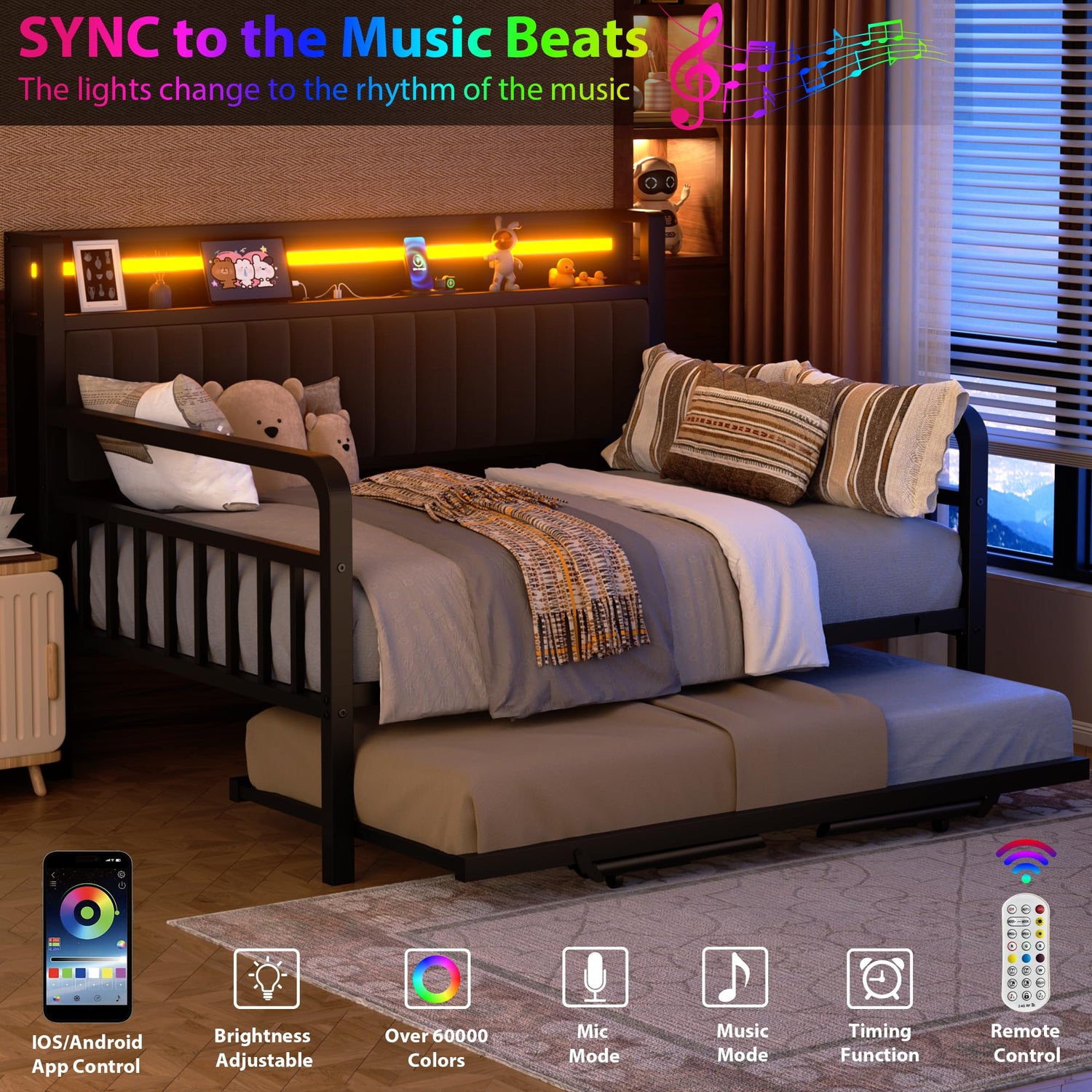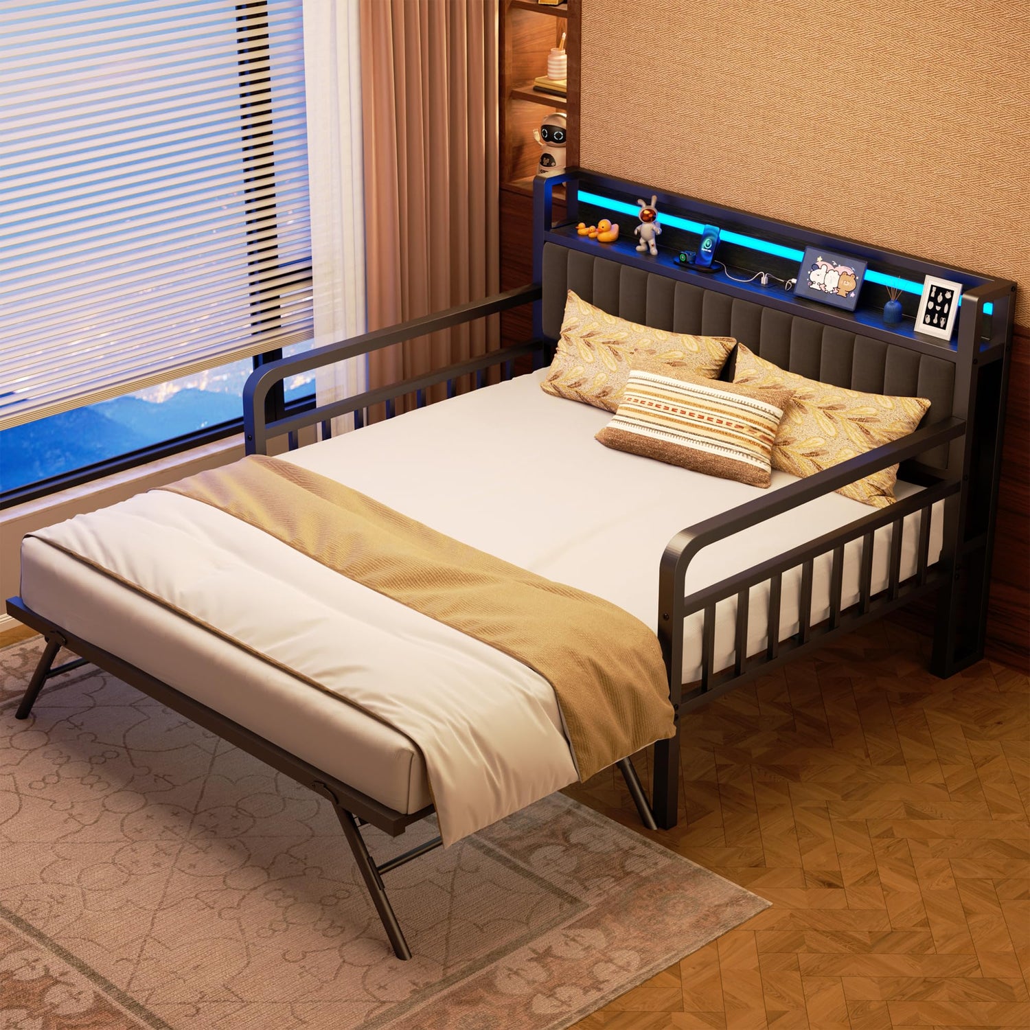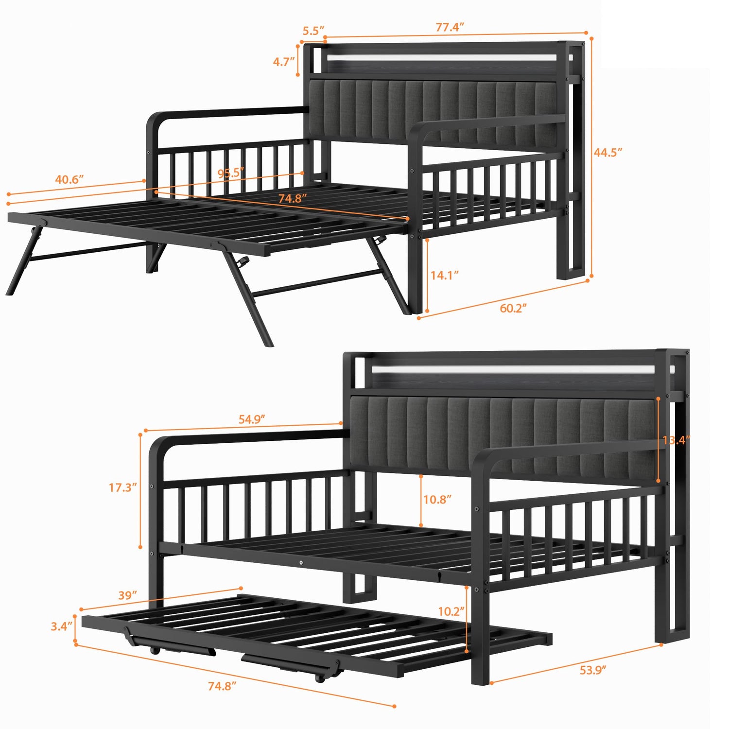 Daybed with Trundle and LED Light, Heavy Duty Metal Full Bed Frame with Upholstered Storage Headboard & Charging Station, Day Bed Pop Up Trundle Bed for Living Room,Bedroom and Guest Room, Black