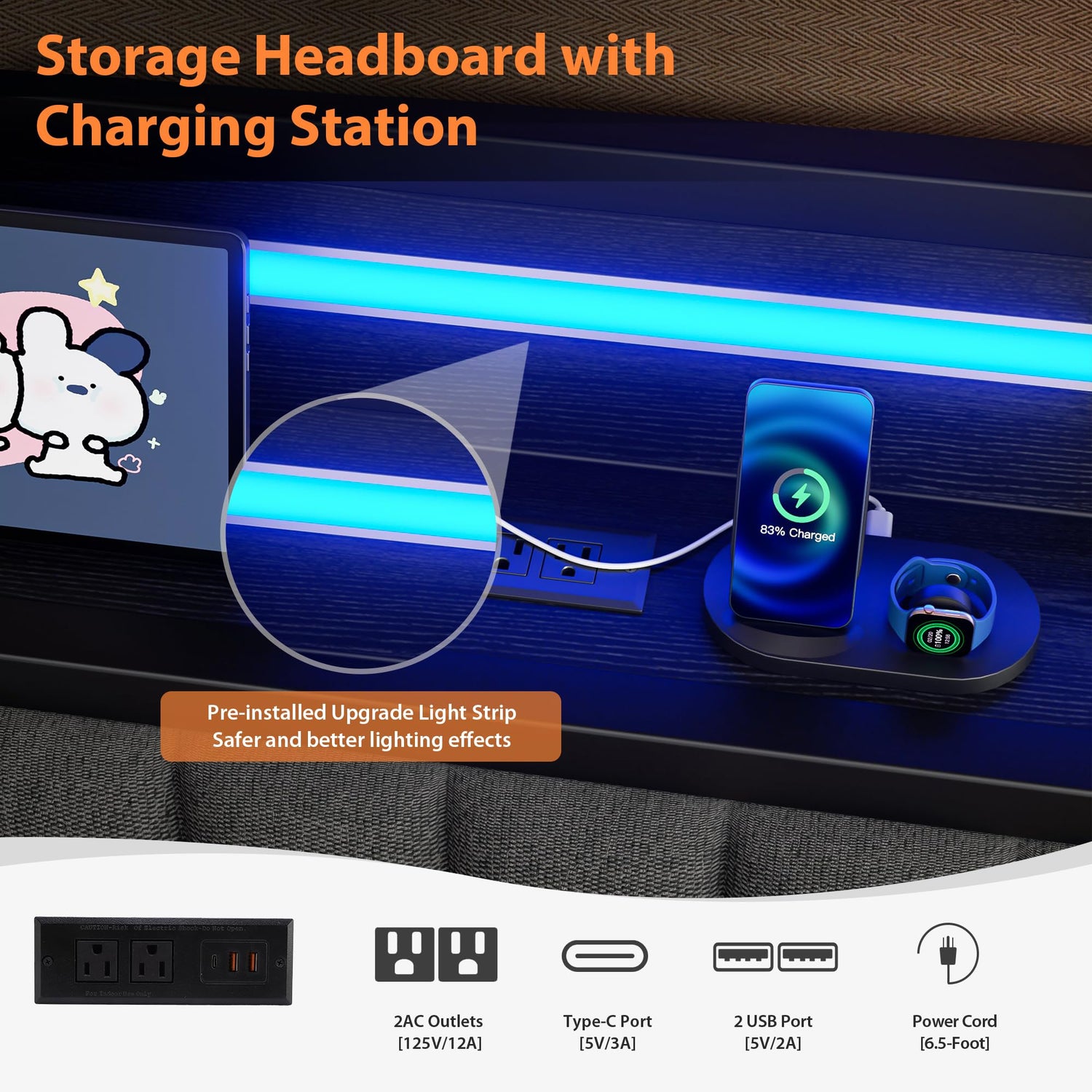 • MULTI-FUNCTION RGB LED BED: The headboard is equipped with a built-in smart RGB LED light strip(Housed in a unique transparent aluminum casing, making it more reliable and providing a soft, even lighting effect compared to exposed light strips) You can control it via buttons, app, or remote, offering over 16 million colors and 20+ preset lighting effects. Whether you need warm lighting for reading, vibrant colors for a party, or a practical nightlight for children who are afraid of the dark, this LED bed frame suits every mood and need. Especially in intelligent music sync mode, the LED lights flash in rhythm with the music, providing you with an immersive home concert experience