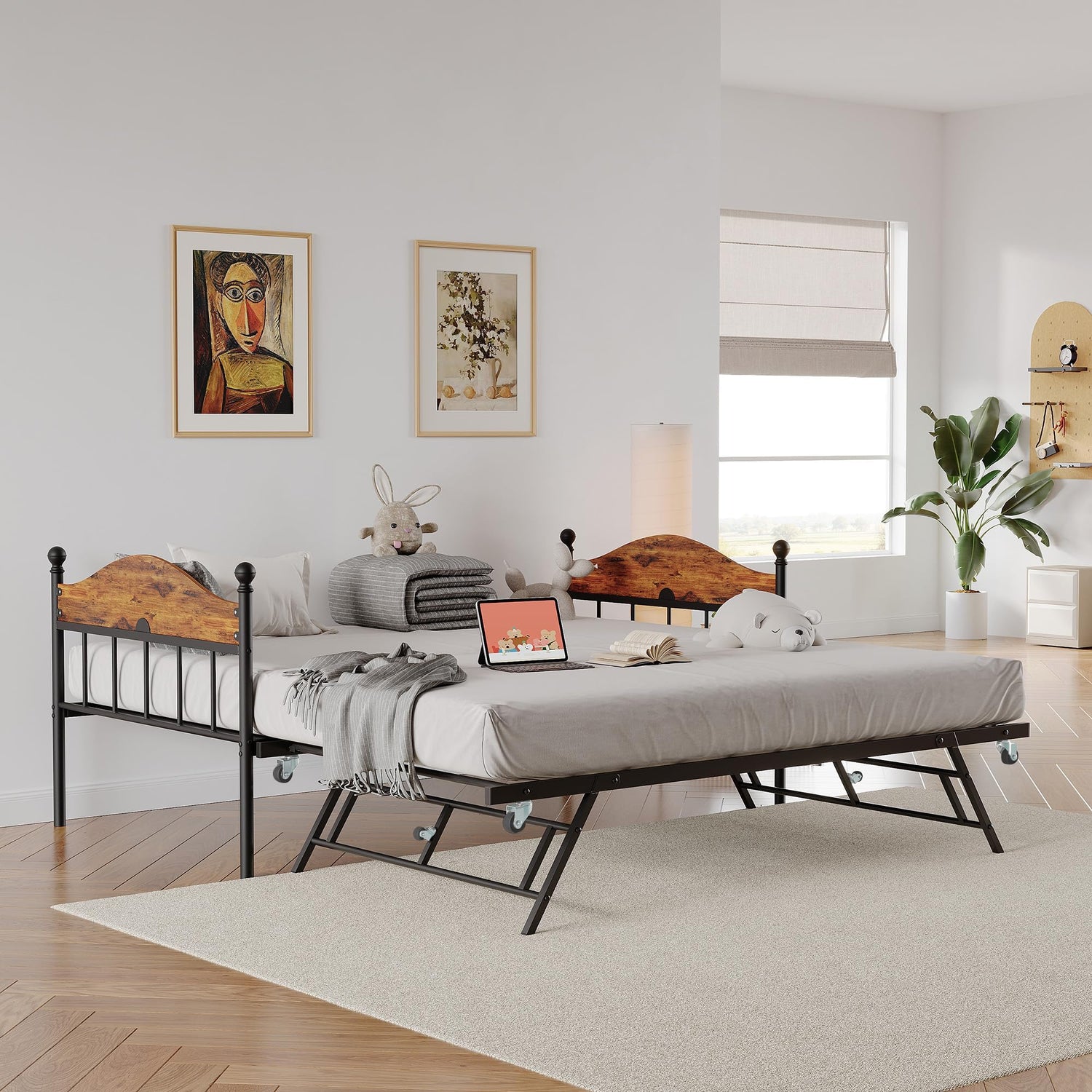 Daybed with Trundle, Sturdy Metal Twin Size Day Bed with Stylish Headboard, Height Adjustable Trundle Bed Twin, Heavy Duty Steel Slats Platform for Living Room, Bedroom and Guest Room, Brown