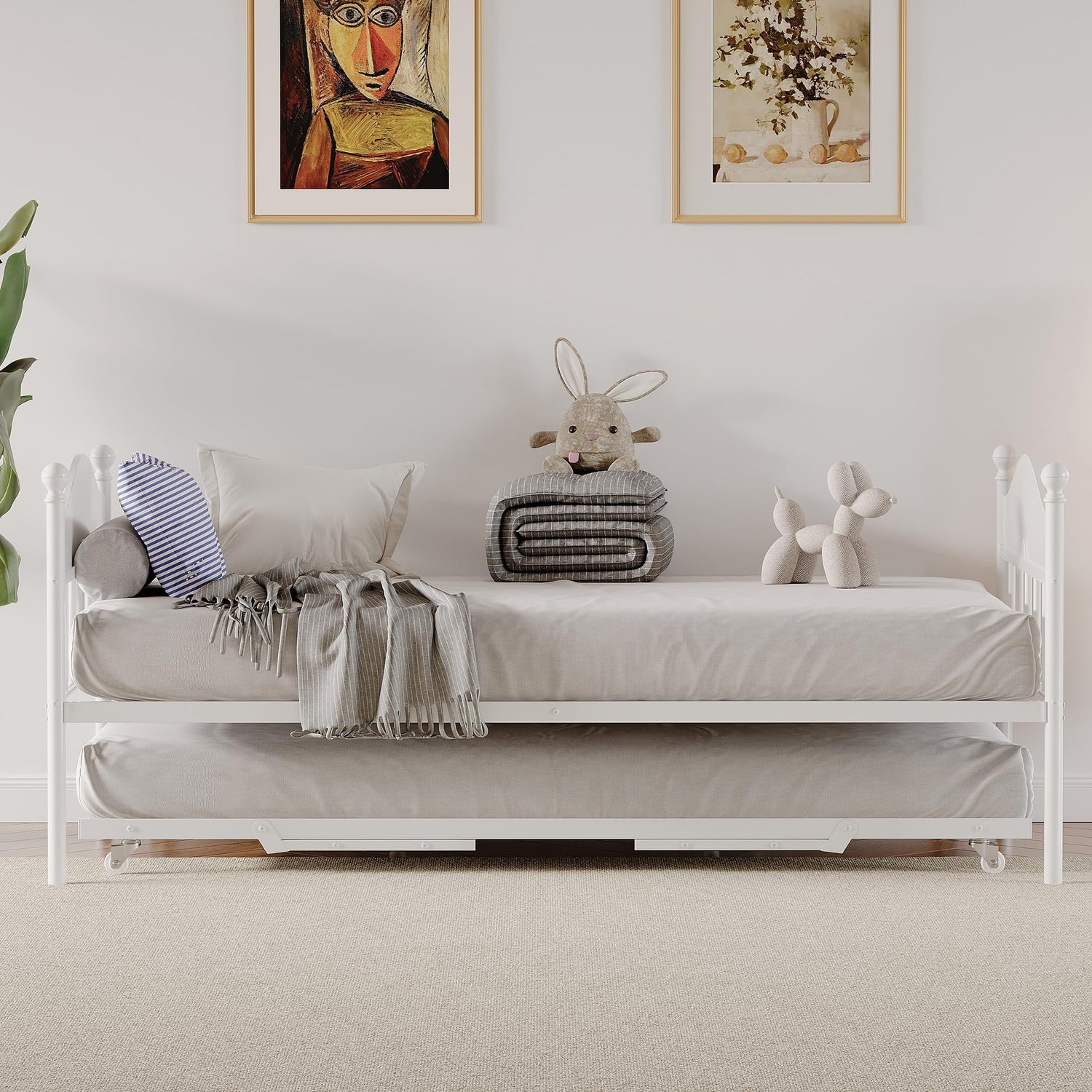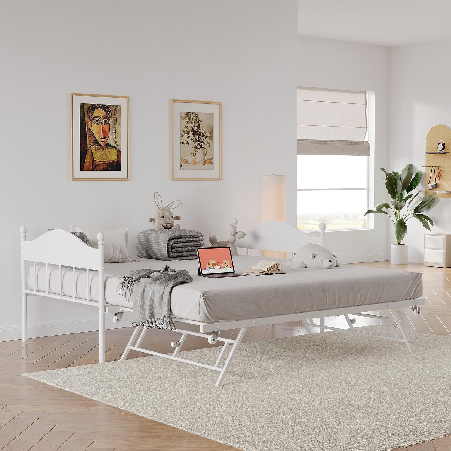 Daybed with Trundle, Sturdy Metal Twin Size Day Bed with Stylish Headboard, Height Adjustable Trundle Bed Twin, Heavy Duty Steel Slats Platform for Living Room, Bedroom and Guest Room, White
