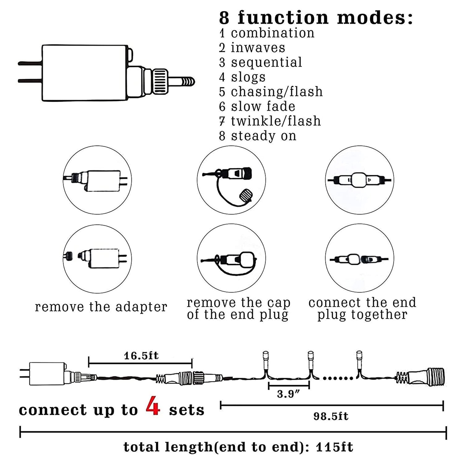 - 8 Modes: Dazzle Bright 300 LED string lights with 8 light modes: combination, in waves, sequential, slogs, chasing/flash, slow fade, twinkle/flash, by pressing the button on the plug to change the mode, using different pattern to fit different application require.