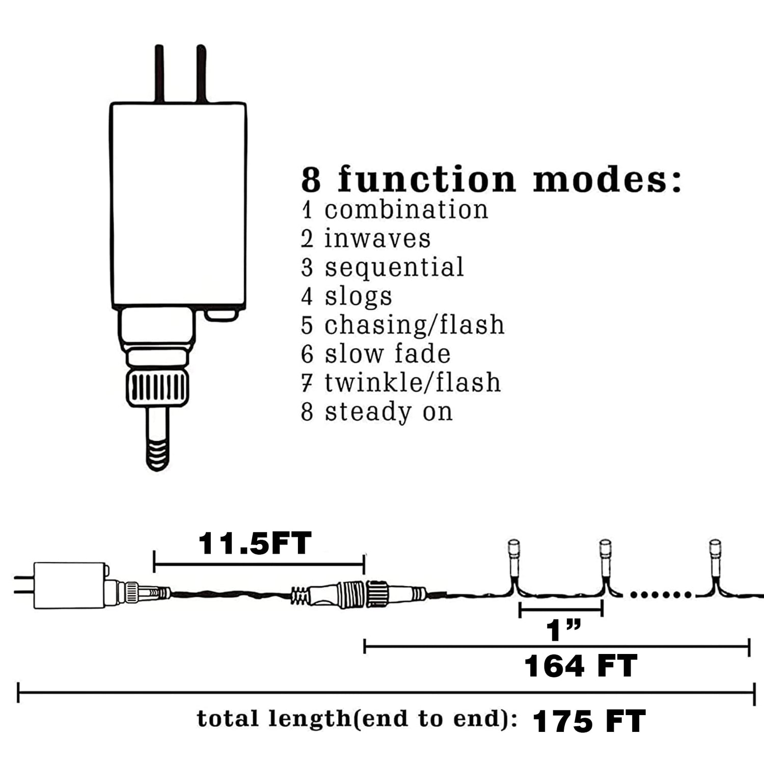 - 8 Modes: Dazzle Bright 300 LED string lights with 8 light modes: combination, in waves, sequential, slogs, chasing/flash, slow fade, twinkle/flash, by pressing the button on the plug to change the mode, using different pattern to fit different application require.