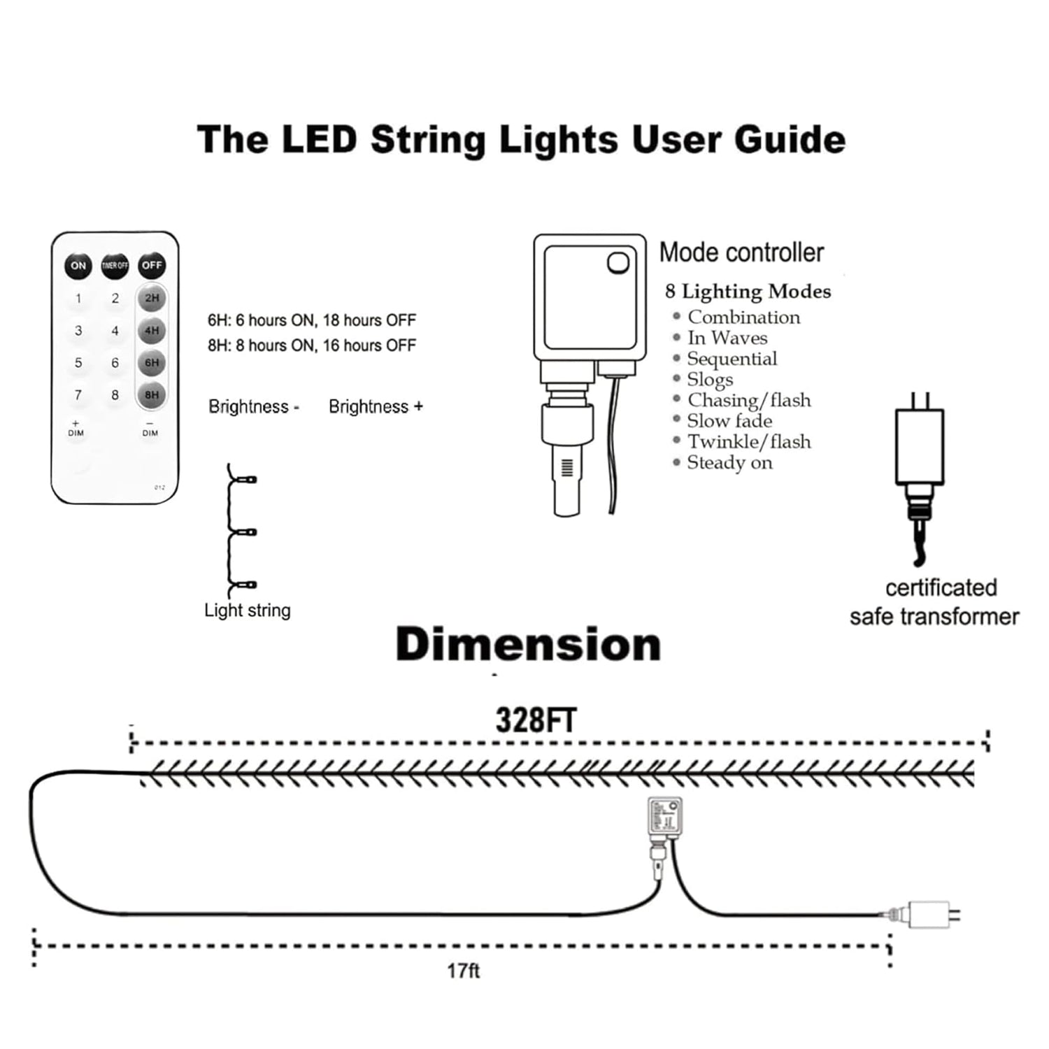 • Remote Control: The Christmas string lights can be controlled with wireless remote, you can set different, modes, timer, brightness, etc. There are 8 lighting modes (combination, in waves, sequential, slo-glo, chasing/flash, slow fade, twinkle/flash, steady on). It also has 4 timer modes, "2H" (2 hours on/22 hours off), "4H" (4 hours on/20 hours off), "6H" (6 hours on/18 hours off), "8H" (8 hours on/16 hours off).