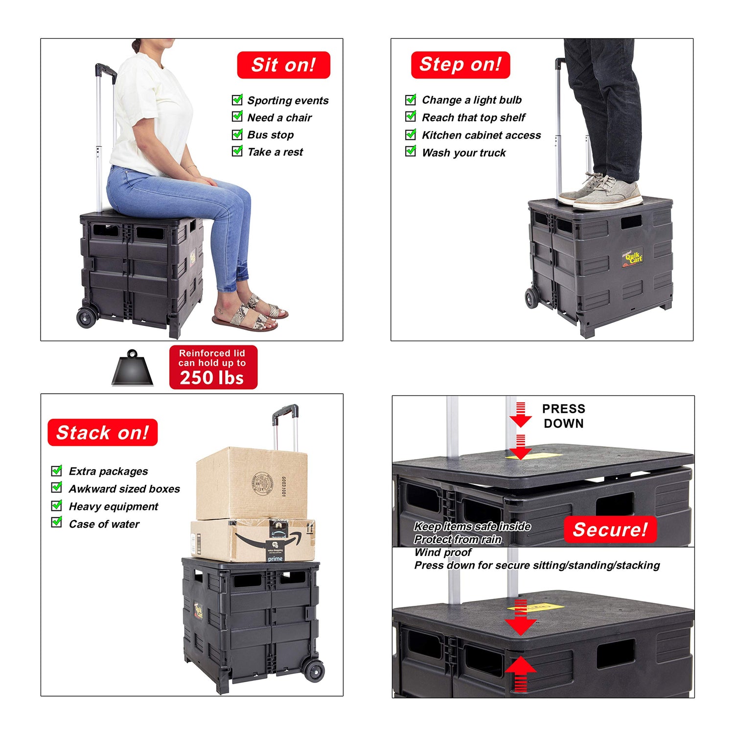 Details: Original Quick Cart. Use it, abuse it, store it! This can be used for transporting, shopping, traveling, portable storage, and seating and as a stepping stool. This can be abused by hauling up to 80 pounds, has a durable heavy duty plastic seat. It can be stored by collapsing down to 3 inches thick, is rust proof, and weighs less than 8 pounds. This package contains one box trolley with the dimension 18x18x3 inch. This rolling bin facilitates the transport of groceries for seniors like no other utility carrier because of its ergonomic retractable handle. Keep your document organized on this wheeled utility organizer. Use this rolling cart (folding cart) as a rolling tool box, rolling cart for teachers, laundry basket with wheels, rolling files carts with wheels or file crate.