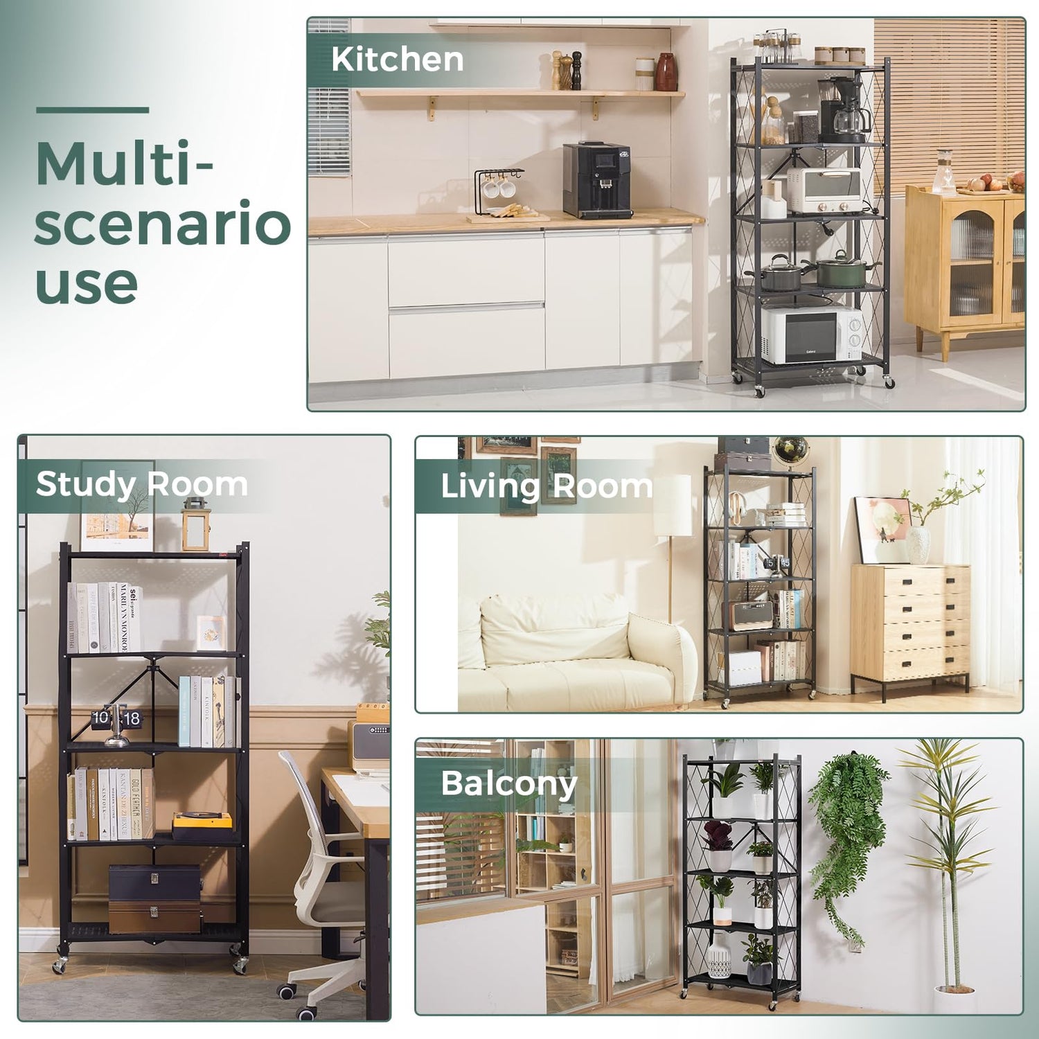 DEANIC 5 Tier Foldable Storage Shelves with Wheels, Large Capacity Shelving Unit, Freestanding Metal Wire Shelf Rack, No Assembly Organizer Rack for Garage Kitchen, Basement, Pantry(Black)
