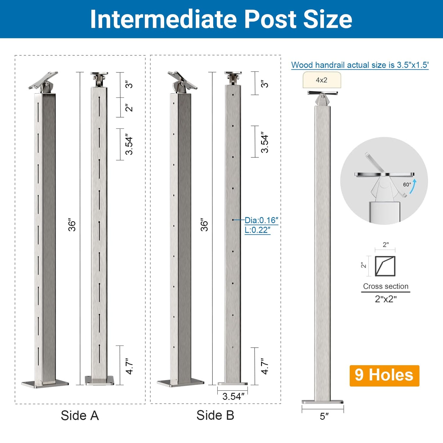 - 【Size 】Our cable railing post is 36'' in height and 2"×2" in square width; Both baseplates are solid welded with the square post as an intergraded part. This unique design not only reduces your labor cost but also lowers the difficulty of installation, Each post is pre-drilled with 9 holes, and the diameter of the hole is 4mm which fits a 1/8 inch cable railing.
