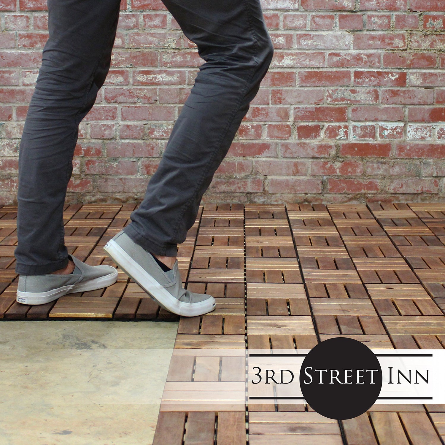 - INDOOR AND OUTDOOR DECK FLOORING - 3rd Street Inn Deck Tiles create a beautiful space both inside and outside. All that is needed is a solid surface and the deck flooring can be laid directly on top of it. The interlocking wood tiles can be installed on top of concrete, wood, carpet, pavers, or any other solid surface. Great for decks, patios, balconies, around pools, saunas, showers, sun rooms, mud rooms, bedrooms, and more.