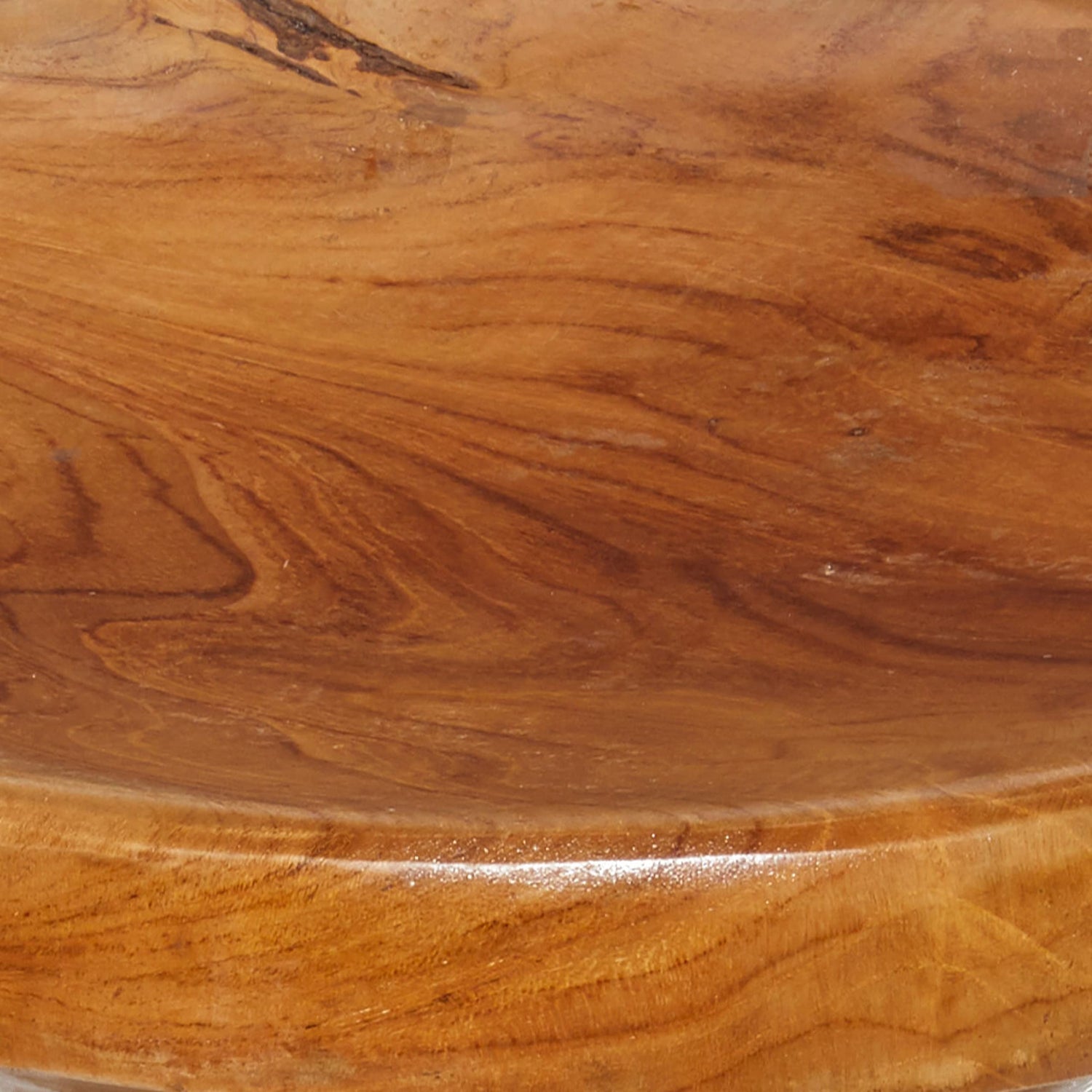 Details: Each piece of this rustic large table has been meticulously carved and chiseled from natural teak wood to form a cohesive unit. With its twist-inspired stand and solid pattern base, this varnished brown living room table presents itself in a distinct round shape. Wipe clean with a dry cloth. As a versatile piece, this brown end table can serve as an ideal side companion to large sofa sets or as a footrest in narrow entryways and hallways. This item ships in 1 carton. The one-of-a-kind item you have purchased is made from the stumps and unused trunks of harvested teak trees. This teak comes from ecologically managed forests. Once the tree is harvested, the remaining stumps must be removed to make space to plant replacement trees. In the past, these pieces would be harvested and then burned to dispose of them, which created pollution. Today we use these tree stumps and trunks to create beautiful, handcrafted pieces for your home. Coloring, cracks, and shapes will vary between items. Each one is unique and the artisan works to bring out the inner beauty within the tree to become a cherished piece of art for your home. Suitable for indoor use only. This item ships fully assembled in one piece. Due to the live edges of the piece, each is unique, so no two products will have an identical pattern, shade, or cut. Maximum weight limit is 100 lbs. Made in Indonesia. This is a single brown colored end table. Rustic style.