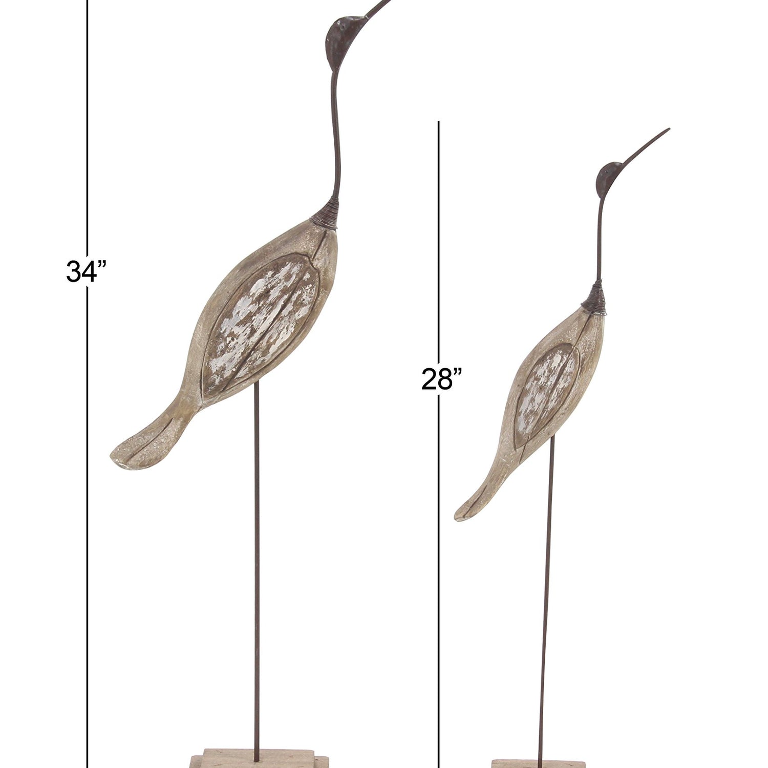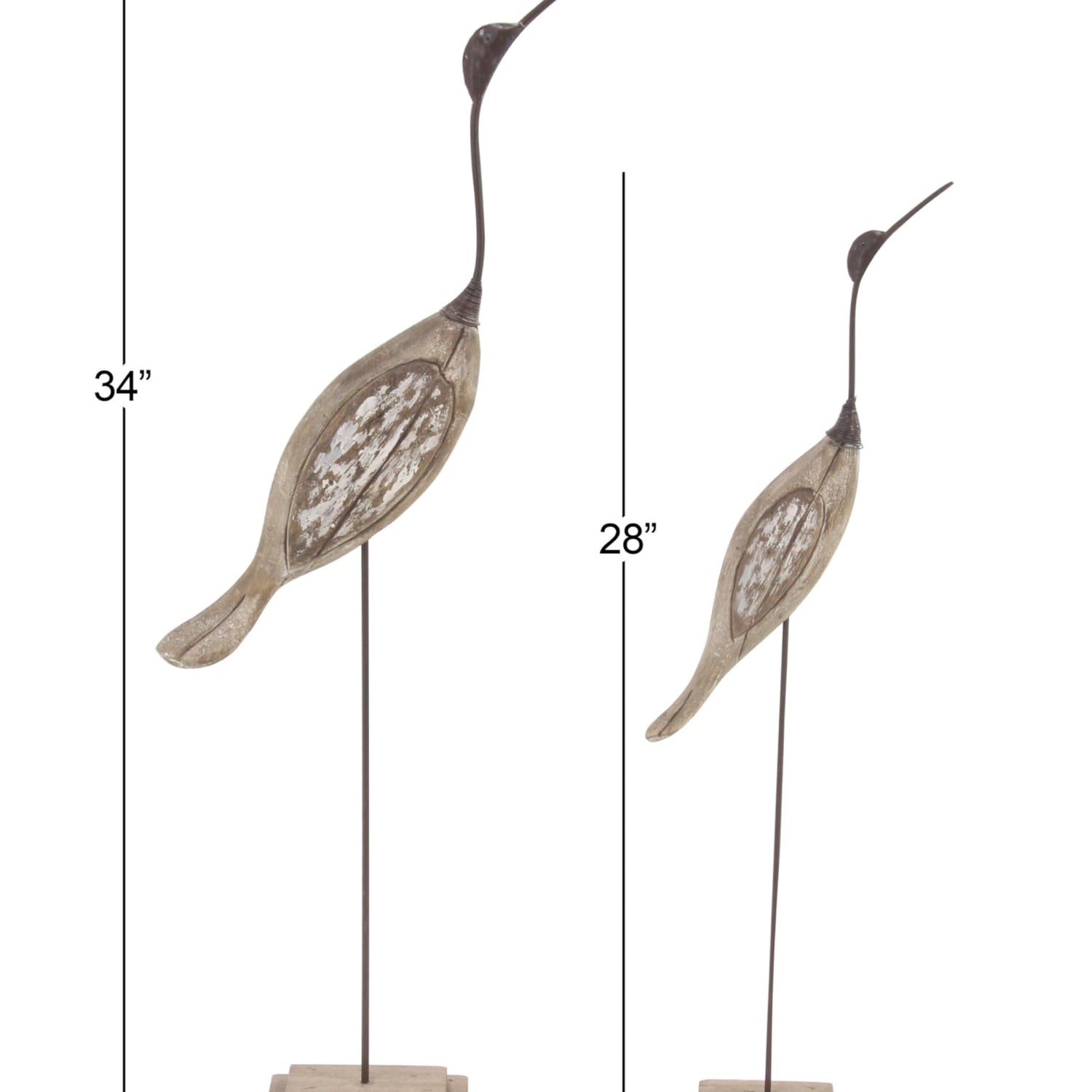 Details: Each piece in this coastal set of 2 accent statues is meticulously carved from wood and mounted on a wooden base. Distressed brown home decor figurines feature two bird figures with long beaks and slender stands on square bases. Wipe clean with a dry cloth. Adorn your surface space by incorporating sculpture into your decor to add depth and texture in your home. An artistic display to showcase your personality and enhance the look of any open table top space. Enhance the coastal ambiance in your living room by placing this bird set of 2 home decor statues on tables or desks. Designed with felt or rubber stoppers at the base that prevent scratching furniture and table tops, as well as sliding around. This item ships in 1 carton. Please note that this item is for decorative use only. Wood sculpture makes a great gift for any occasion. Suitable for indoor use only. This item ships fully assembled in one piece. This brown colored wood statue comes as a set of 2. Coastal style.