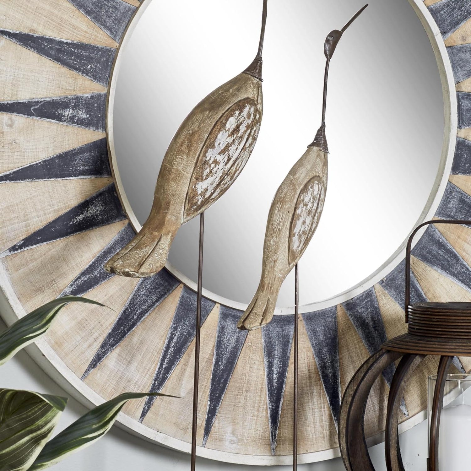 - BIRD ACCENT STATUES: Wood set of 2 sculptures features two birds looking upwards, perfectly balanced on a long and thin metal pole on a square base