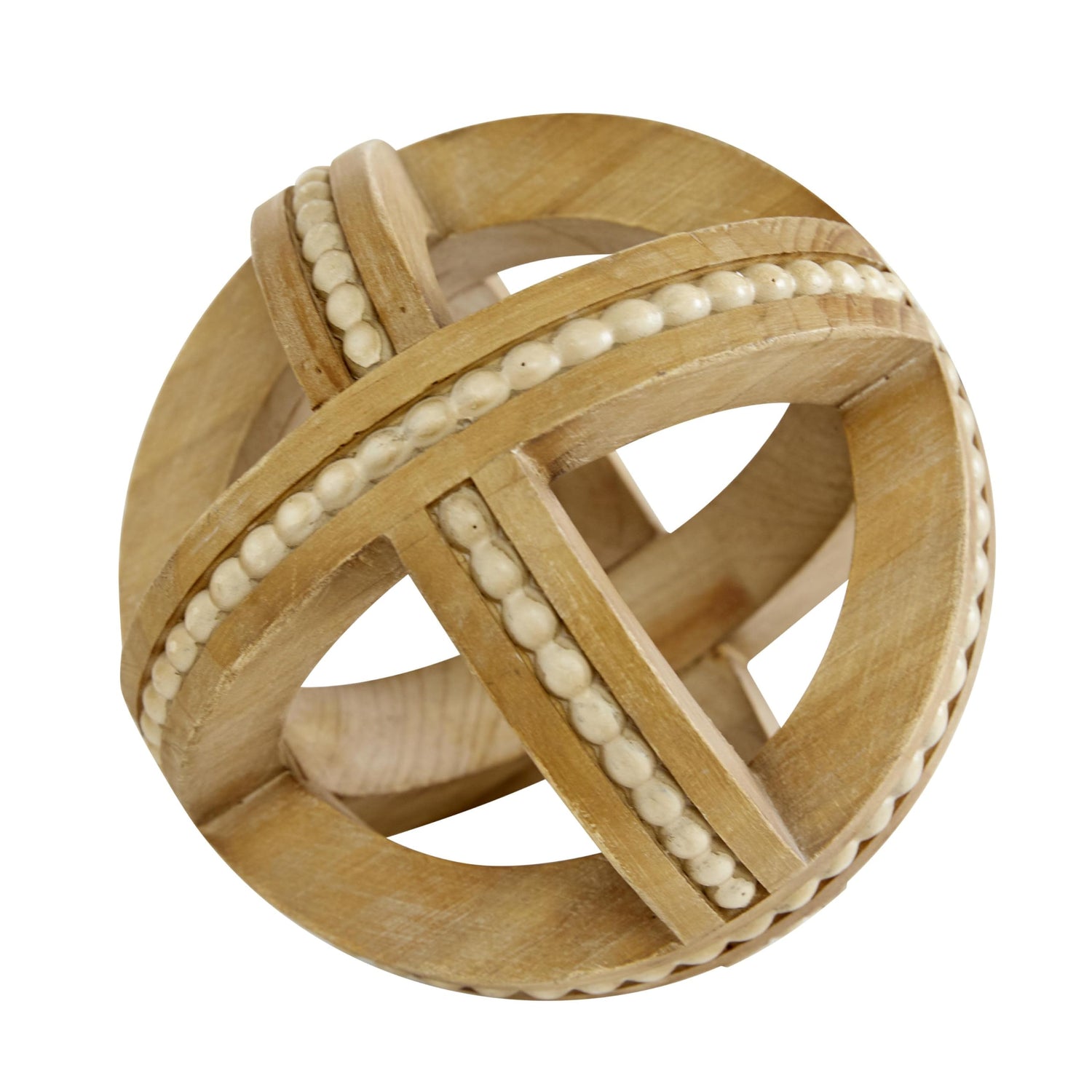 - GEOMETRIC ROUND ACCENT STATUES: This fir set of 3 sculptures features wooden balls adorned with intricately arranged tan beads, adding unique charm