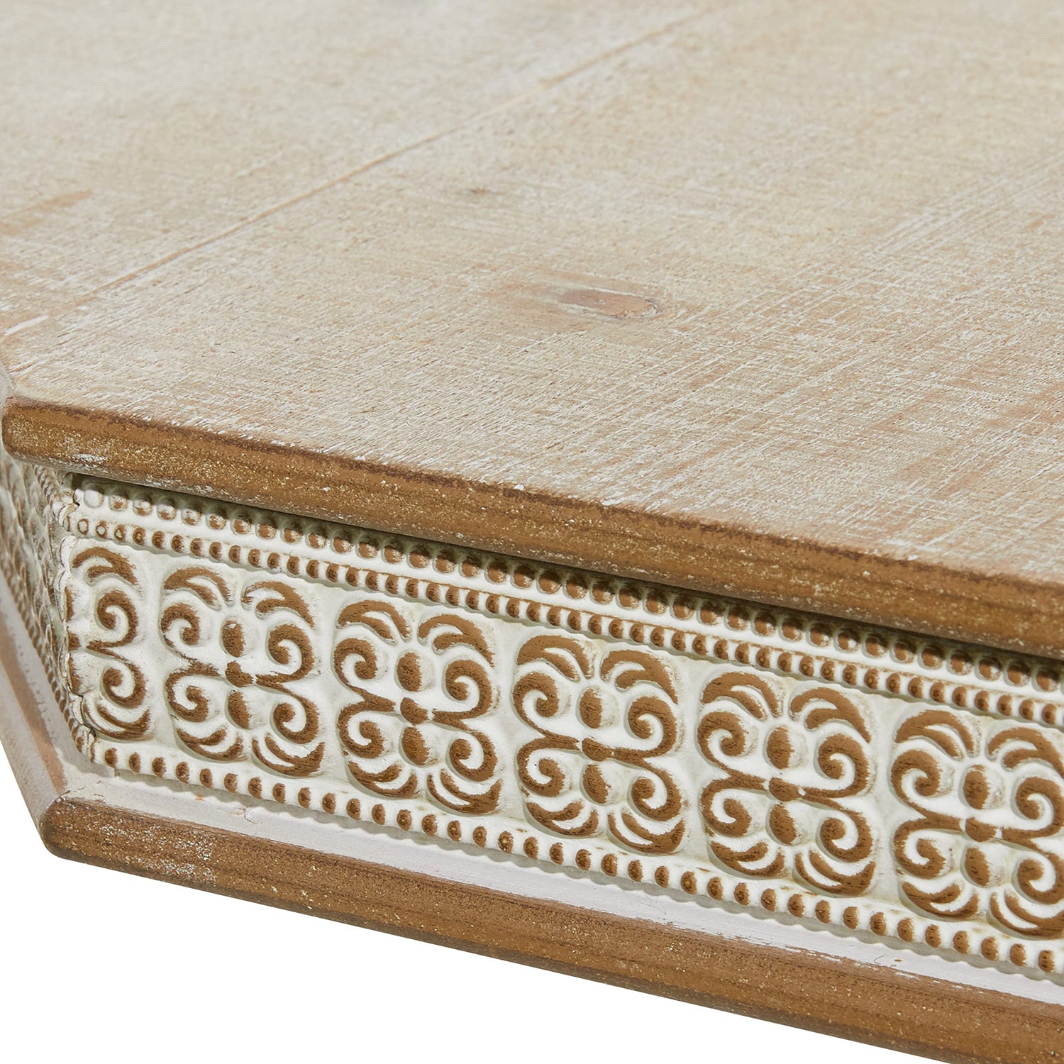 - SCROLL HEXAGON SMALL TABLE: This intricately carved wood accent table features a hexagonal top and base with a turned style post, complemented by elaborate ornate carvings on the side of the tabletop for added charm