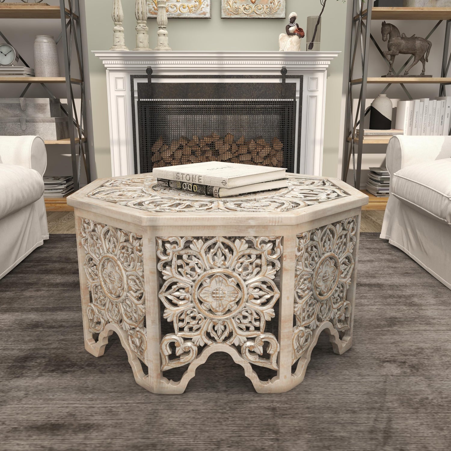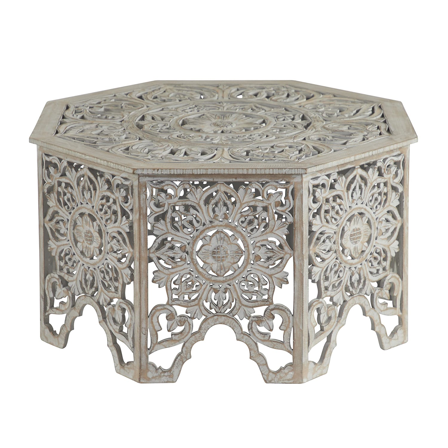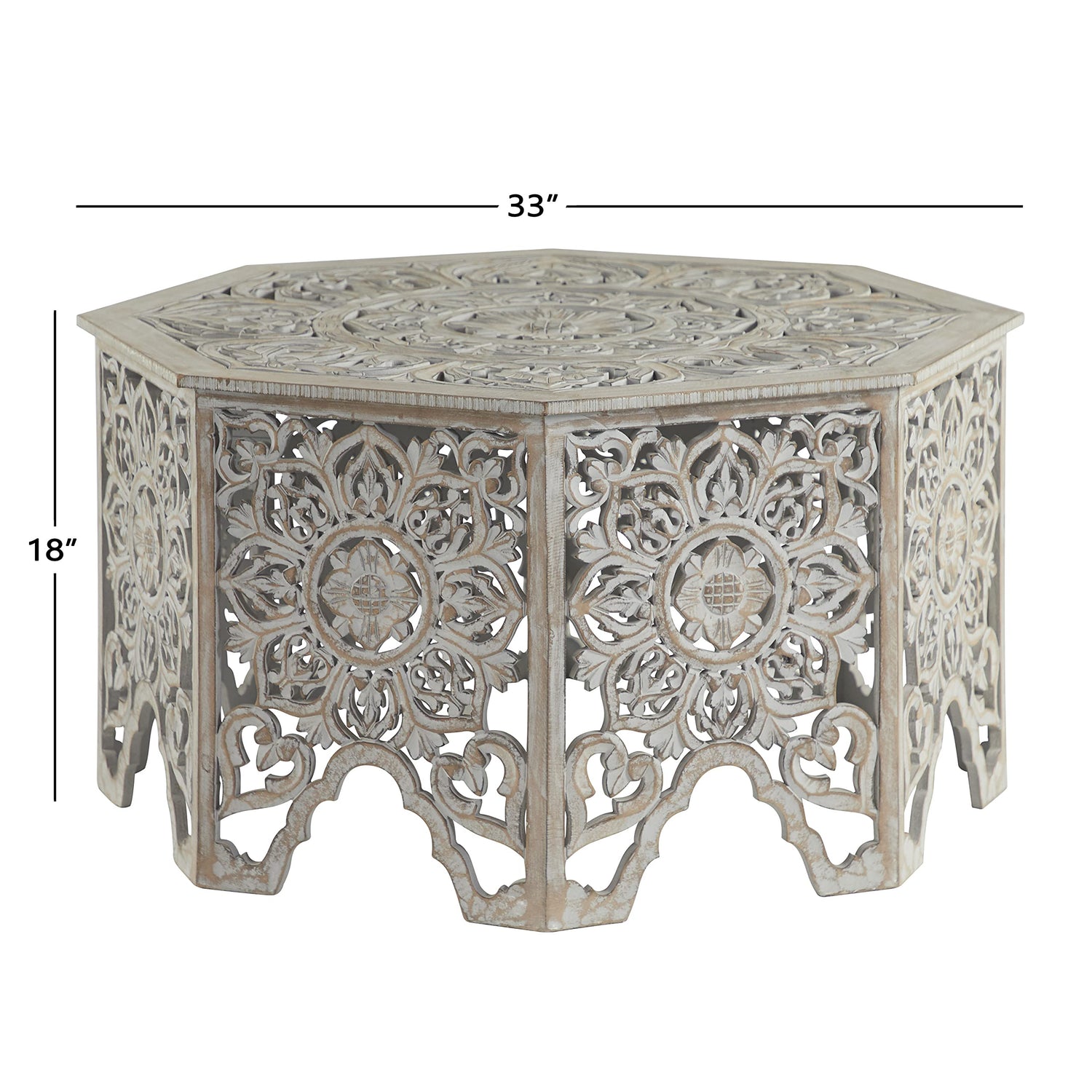 - FLORAL OCTAGON HOME TABLE: This MDF coffee table features artistically carved leaf silhouette shapes throughout the legs and eclectic floral carvings around the octagonal body and tabletop