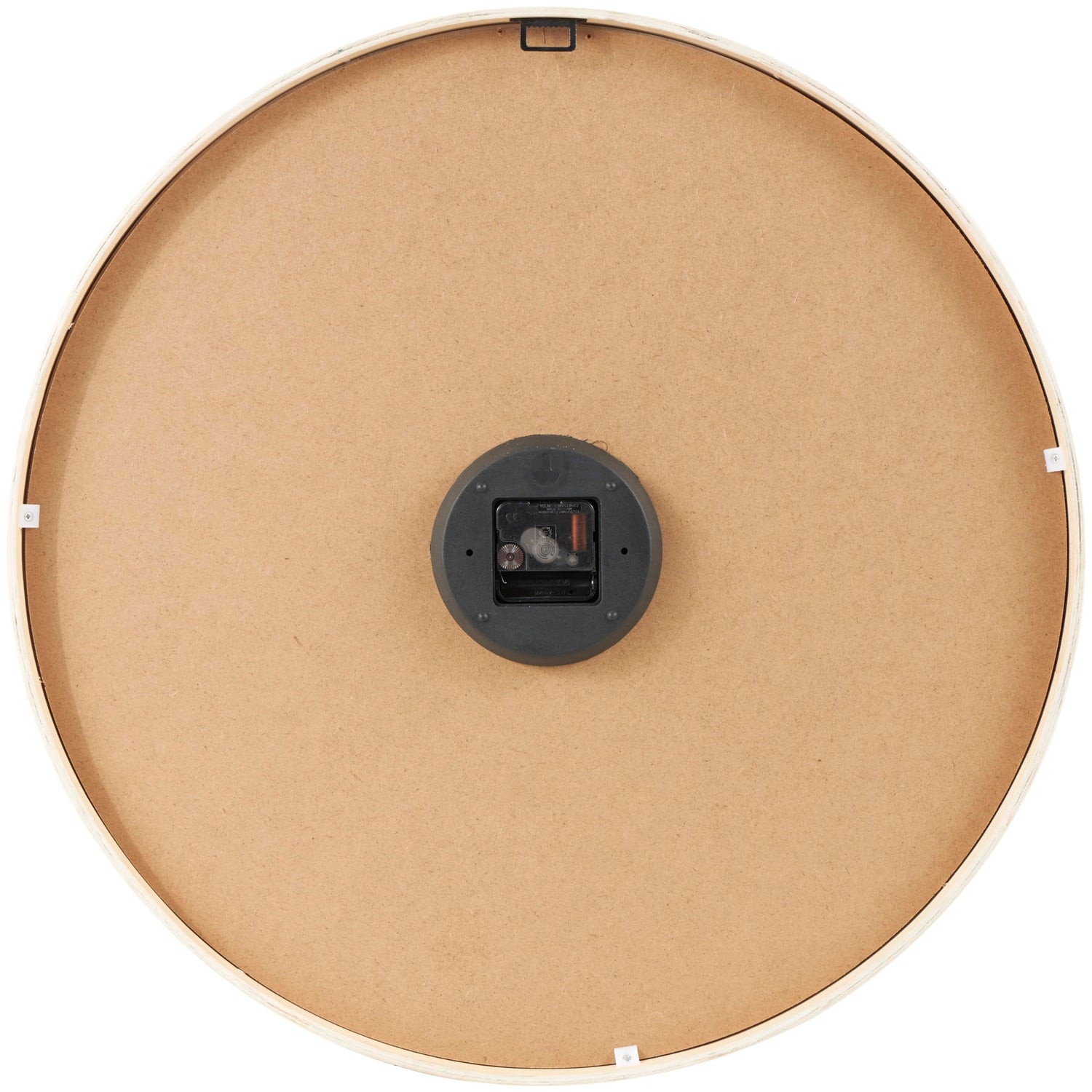 - BROWN AND WHITE OVERSIZED WALL CLOCK: This modern wall clock features a light brown wood frame with black numbers and a smooth white finish, adding a natural and contemporary touch to your interior
