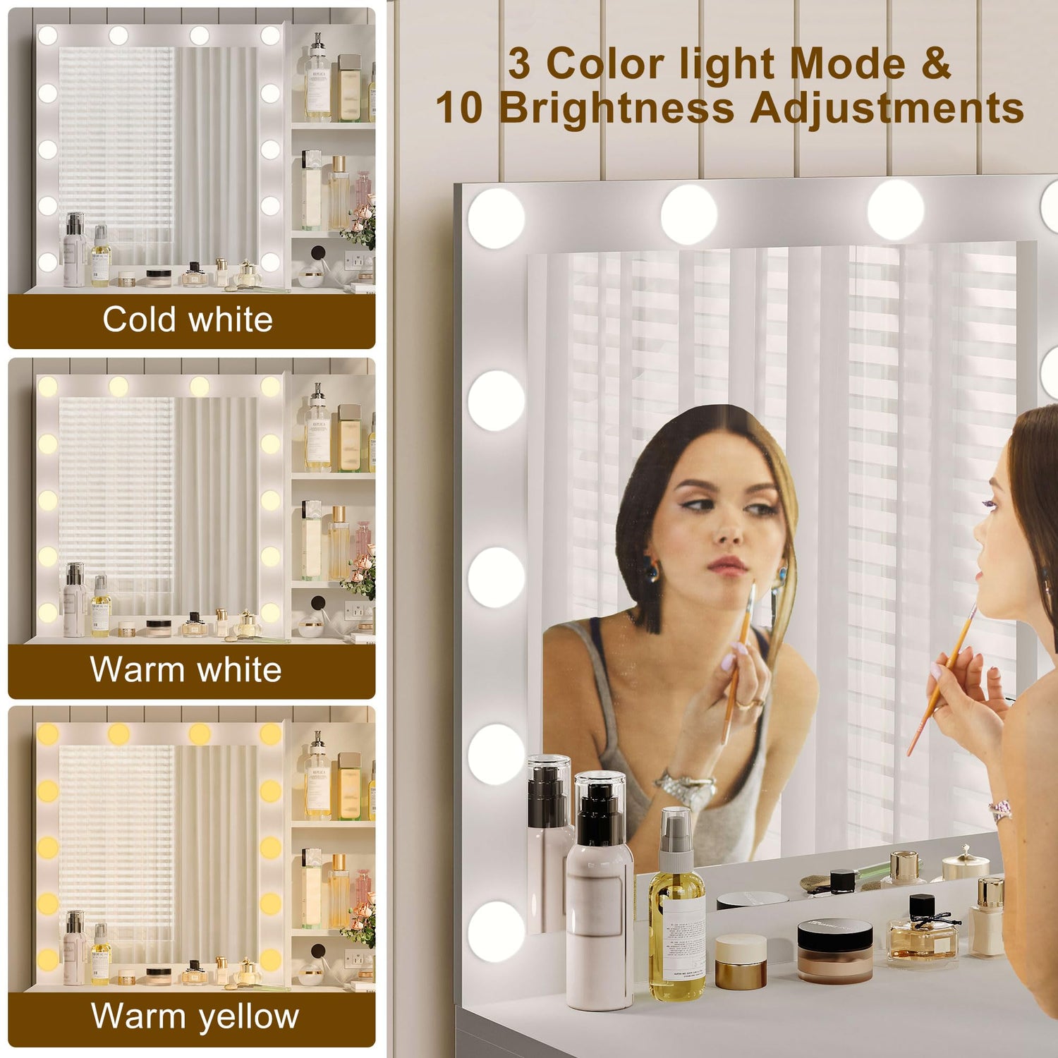 - Bright LED Mirror with 3 Light Modes: This vanity desk features 12 LED bulbs with metal casings for enhanced durability and safety. Easily switch between warm, natural, and cool white lighting to match different makeup needs. Brighter than traditional 10-bulb setups, perfect for detailed beauty routines