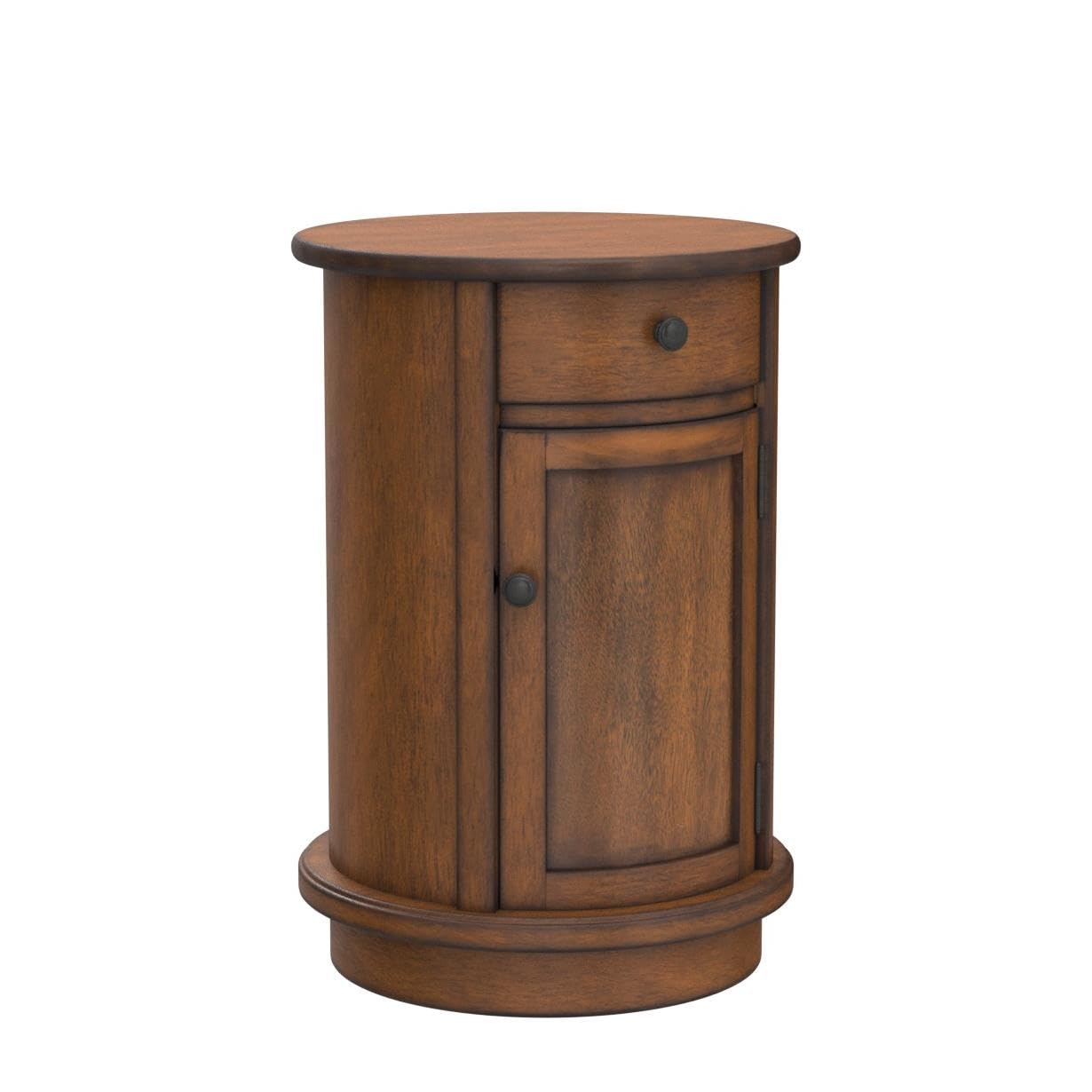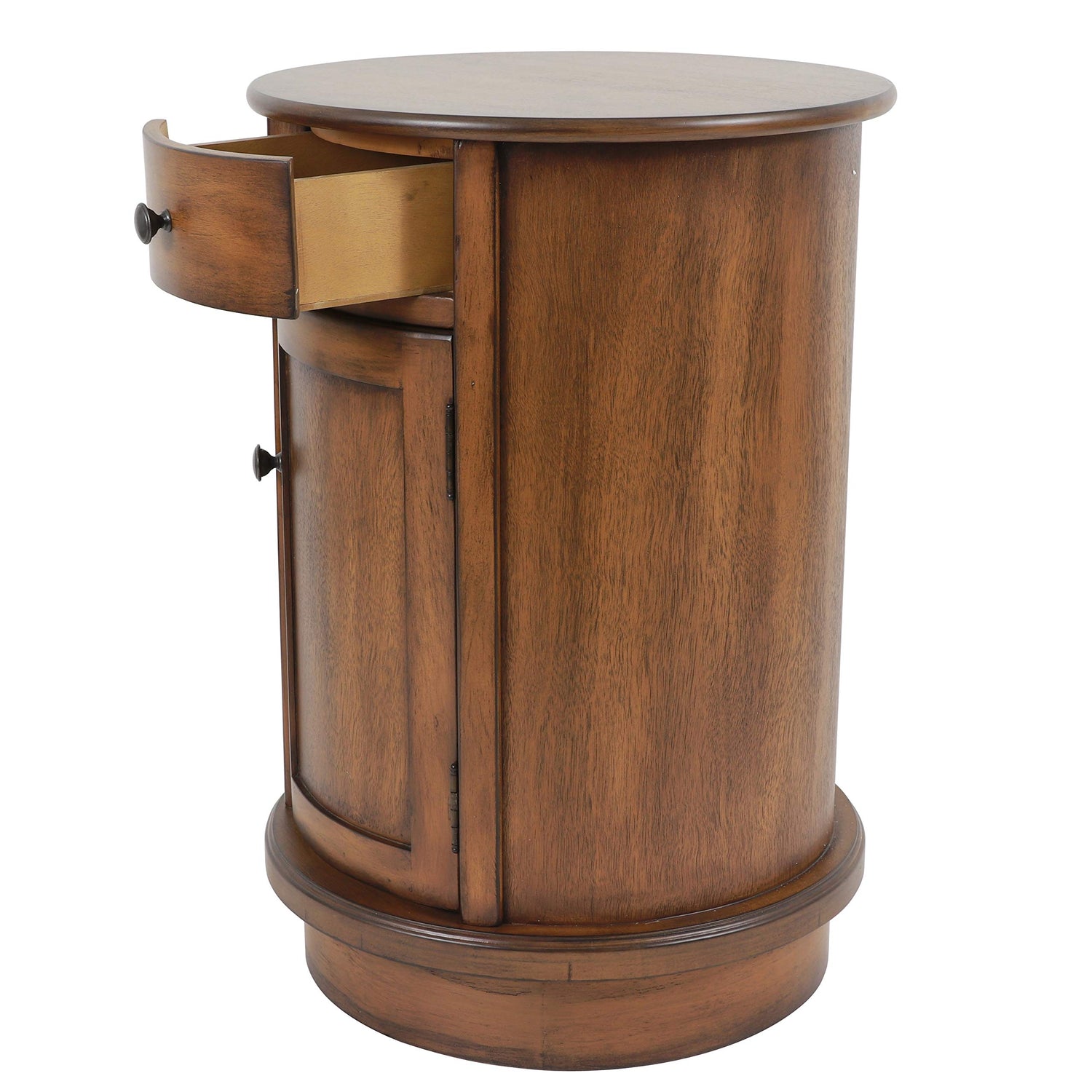 Details: Add warmth and functionality to your living room with this beautifully crafted Keaton Round Storage Side Table. One storage drawer and a single door keep your belongings out of sight but easily accessible. The traditional design and round shape of this storage cabinet adds charming personality to your home. Adorn it with a lovely table lamp and a small accent piece to create a stylized statement piece. Constructed of Chinese oak and veneers for optimal durability. Accent table measures: 17.75 x 17.75 x 26"