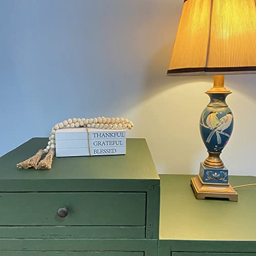 - What you'll receive: a set of decorative white books that say "Thankful, Grateful, Blessed" The set also includes a farmhouse bead garland with tassels, creating a stylish look for your bookshelf, nightstand, coffee table and fireplace.