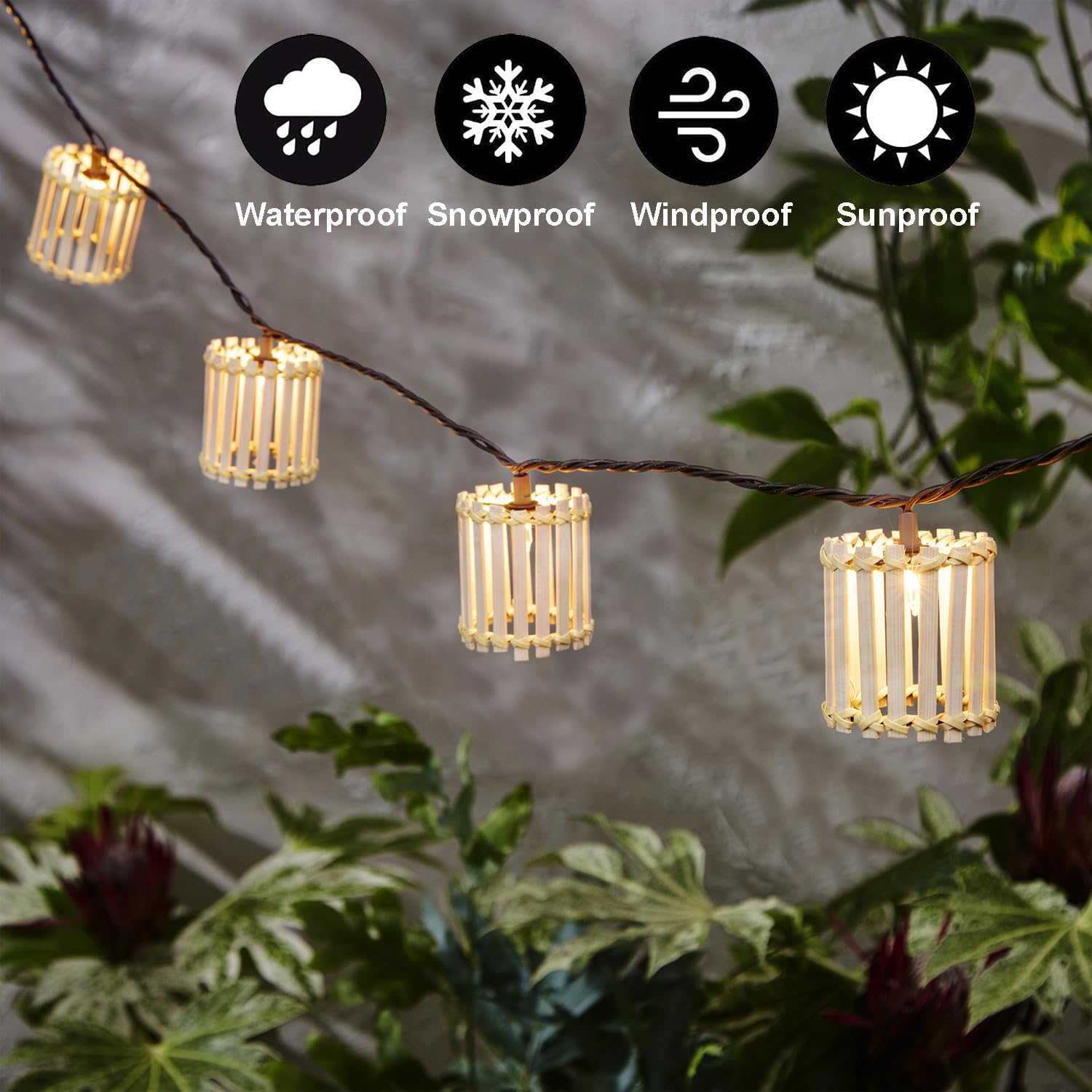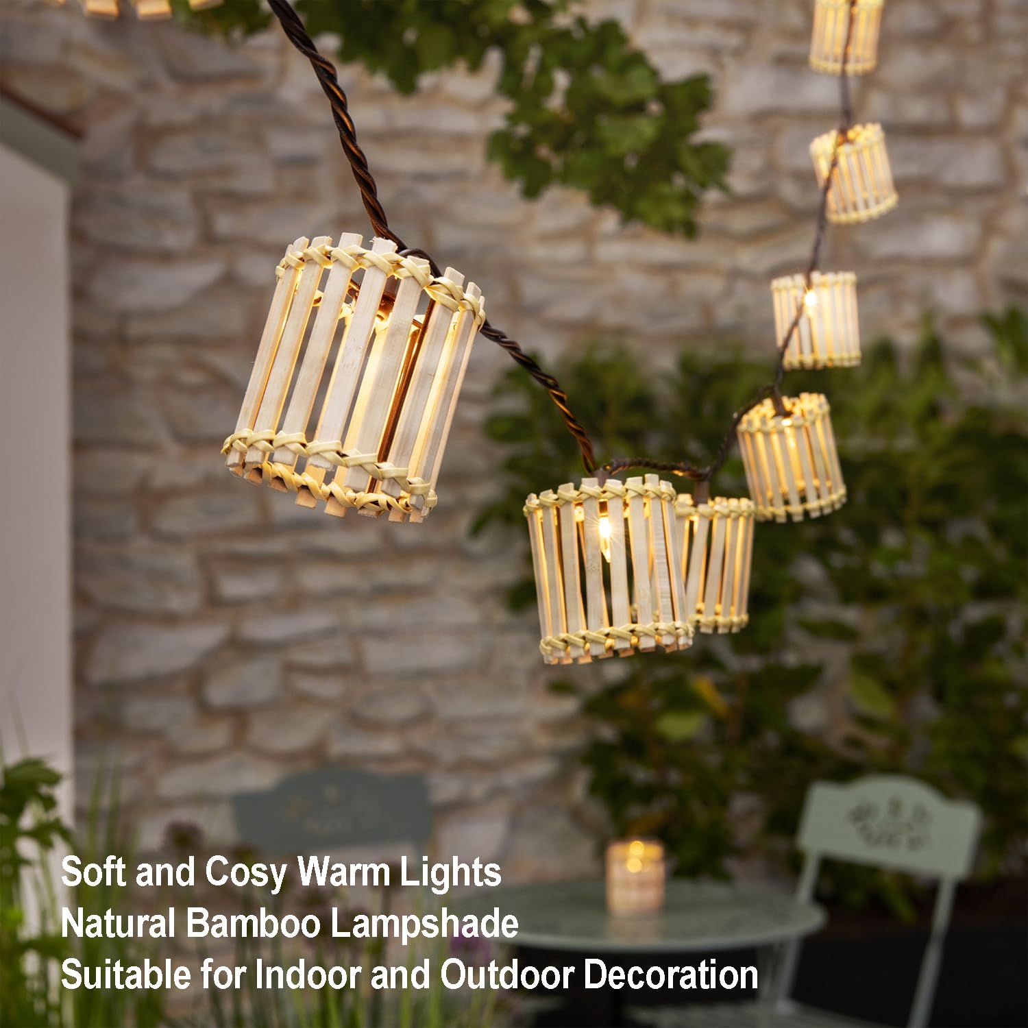 Decorative String Lights, 10 Incandescent Mini Bulbs with Natural Bamboo Woven Lampshade, 8.5Ft Connectable Waterproof Outdoor Lantern String Lights, Perfect for Patio, Garden Balcony, Pergola, Porch
