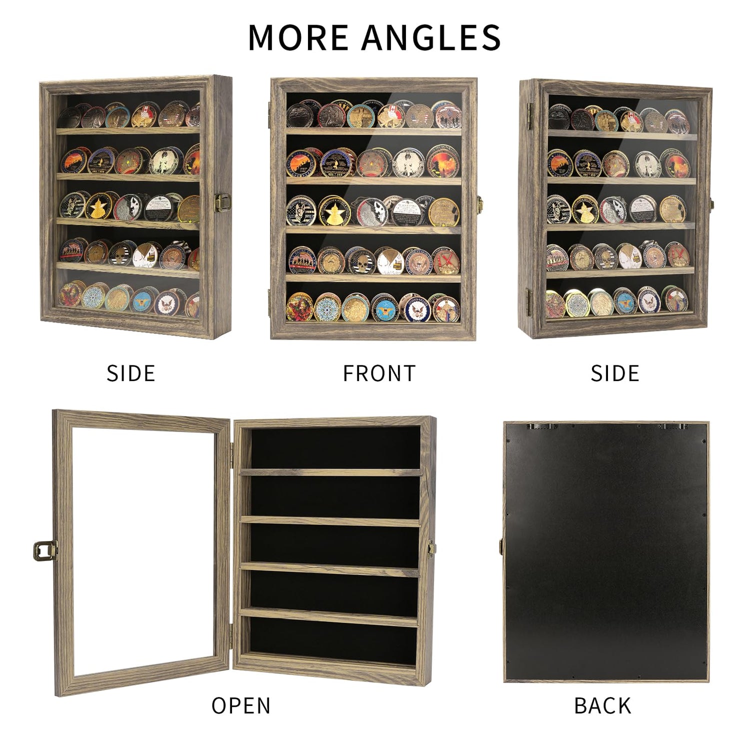 DecoWoodo 5 Rows Military Challenge Coin Display Case with HD Tempered Glass Door, Medal Display Cabinet with Removable Shelves, Poker Chip Coin Holder Shadow Box for Collectors, Rustic Wood Finish