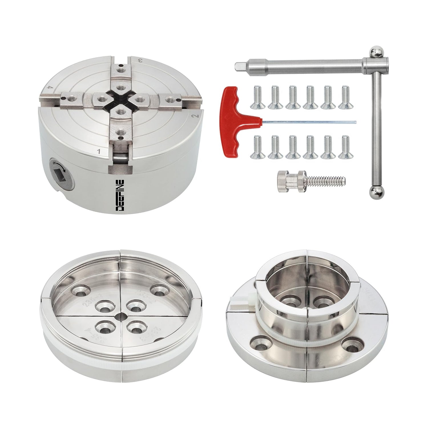 DEEFIINE 4 Inch Wood Lathe Chuck Set 1-1/4"- 8 tpi thread, Nickel Plated Self Centering 4 Jaw Wood Turning Chuck set (2PCS jaws)