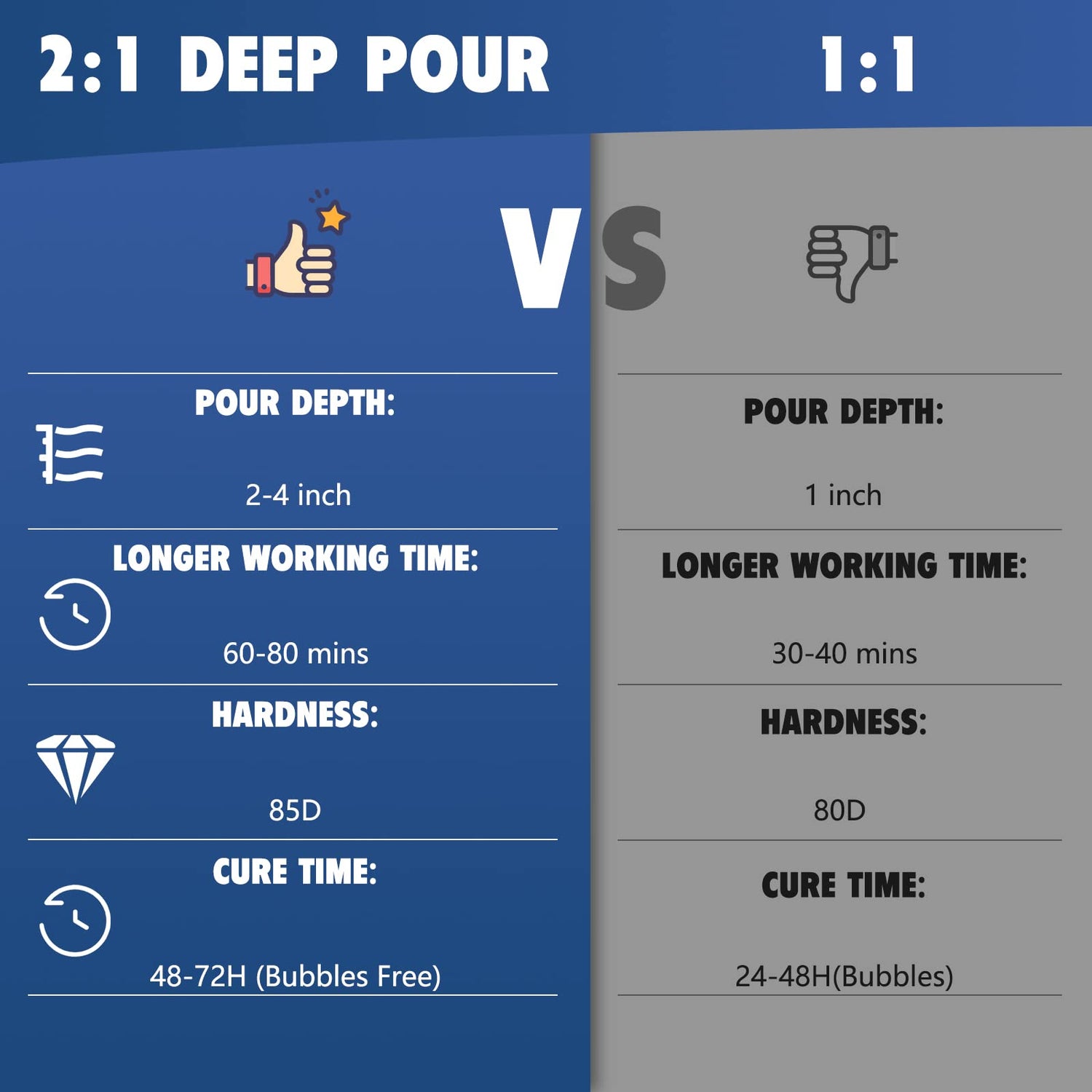 - 2-4 inch Deep-pour Designs: Bring your creative vision to life with our deep-pour epoxy resin that can fill depths of up to 2-4 inches. Perfect for making eye-catching river tables, bar counters, and other unique pieces. NOTE: For best results, keep room temperature at 20℃/68℉ or lower.