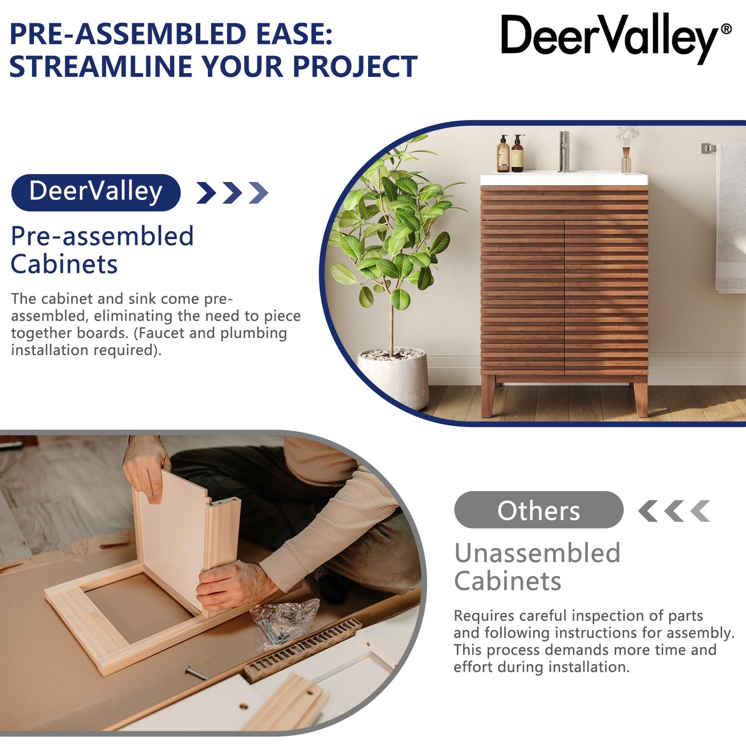 DeerValley DV-1BV0151NW 24" Bathroom Vanity with Ceramic Sink Top, Pre-Assembled Mid-Century Wood Bathroom Cabinet Sink Combo in Walnut White