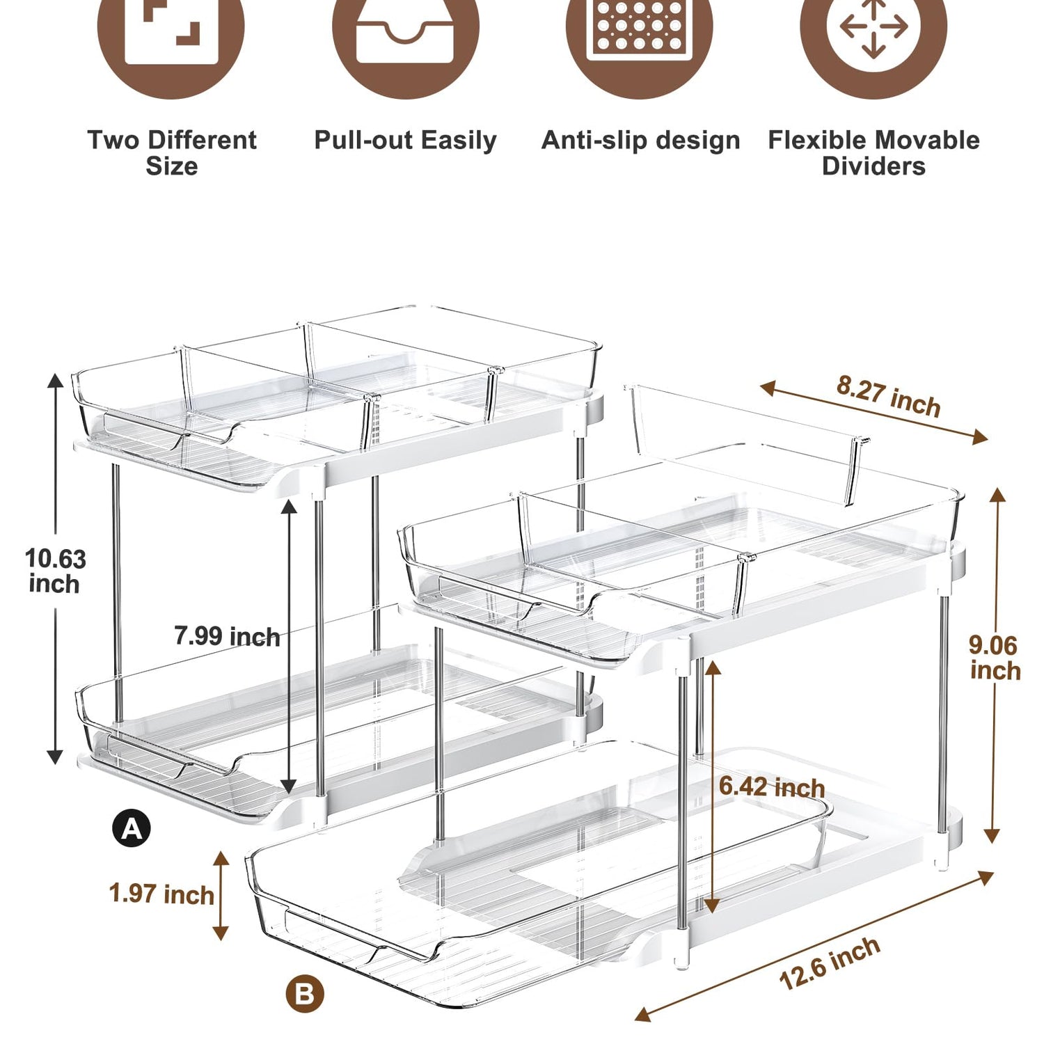 - Available in 2 Different Sizes: The smaller size (S) measures 8.27" x 13.19" x 9.06", and the larger size (L) measures 8.27" x 13.19" x 10.63". High-Low combos make this bathroom organizer versatile for multi-purpose storage and organization, such as kitchen organization, cabinet organizer and storage, bathroom organizer countertop, pantry organizer, under sink organizer, etc.
