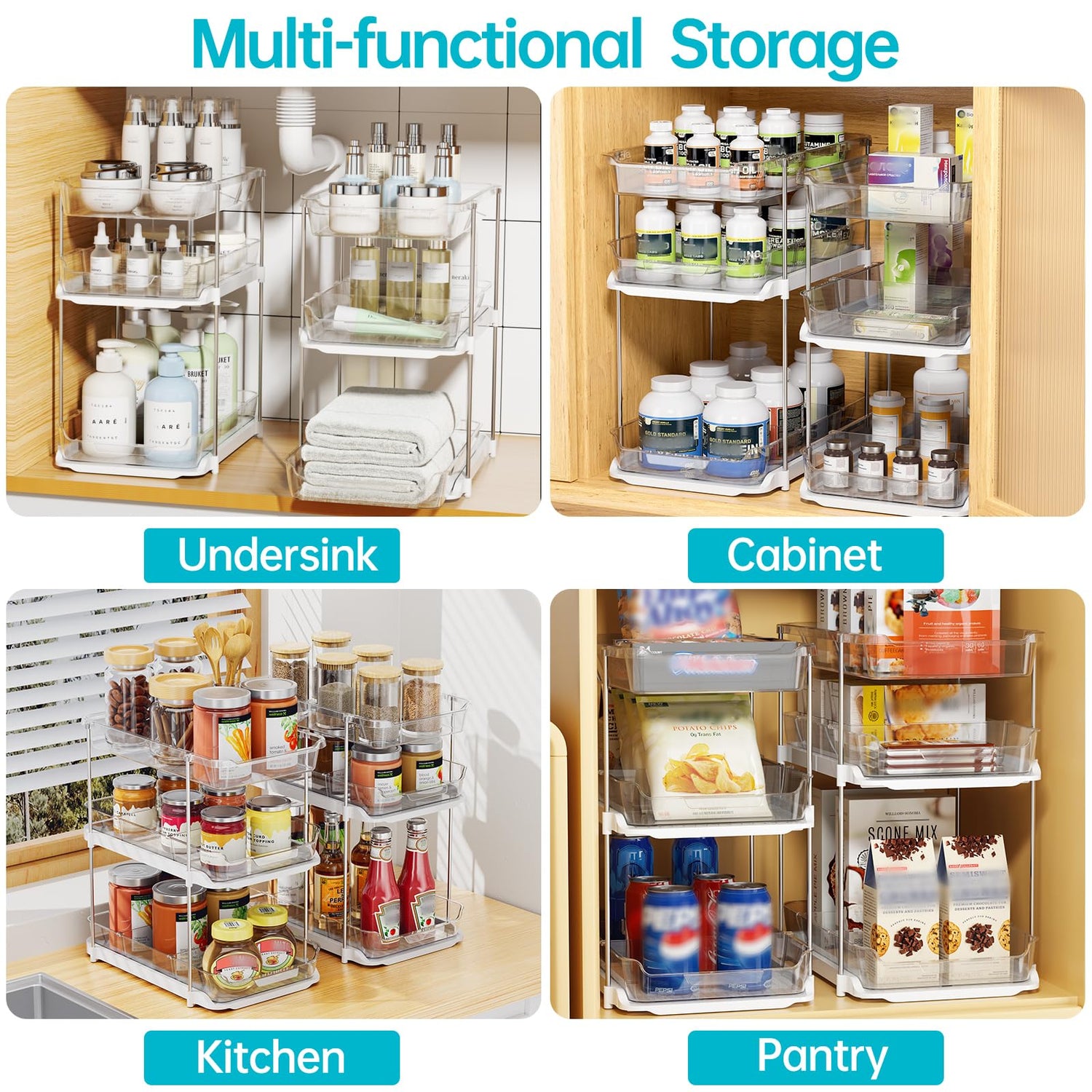 - Multiple Innovative Combinations: Stackable and configurable into "2 + 2 + 2" / "1 + 2 + 3" at will for specific needs. With "2 + 2 + 2", you'll have three 2-tiered slide out sink organizers that can work independently. Imagine one for kitchen organizers and storage, another as bathroom organizers and storage, and the third for cabinet organizers and storage.