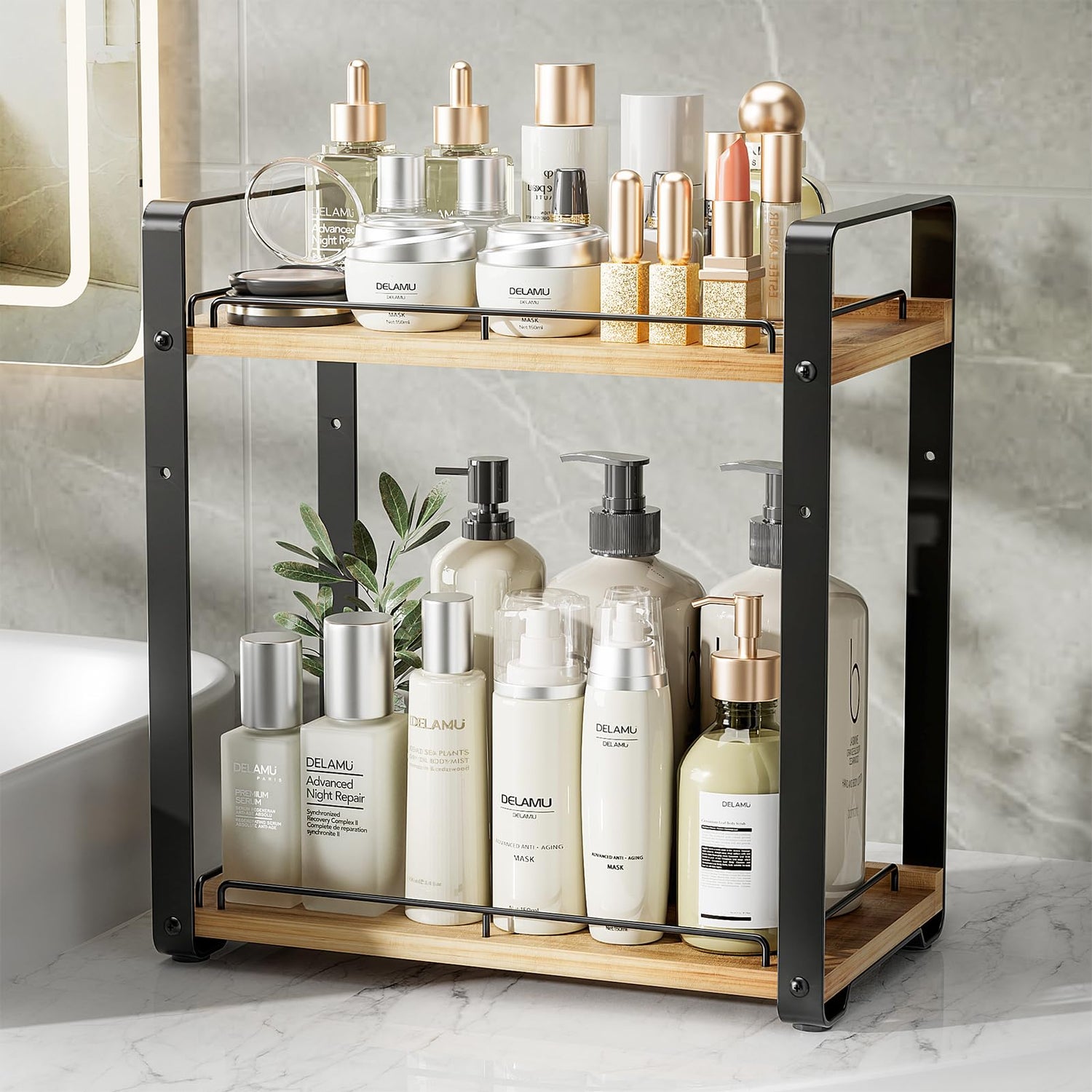 - Space-Saving Design: Delamu 2-Tier bathroom counter organizer is the ultimate bathroom organizers and storage solution, maximizes your small countertop space, keeping your bathroom, kitchen, or vanity neat and clutter-free. Its spacious design is perfect for bathroom vanity organizers, offering ample room for skincare, makeup, and toiletries