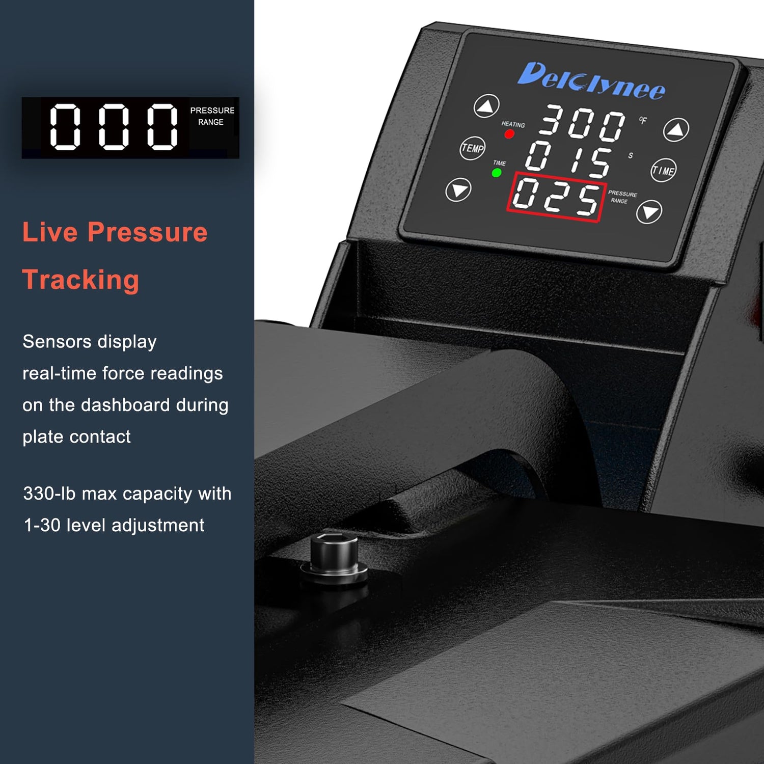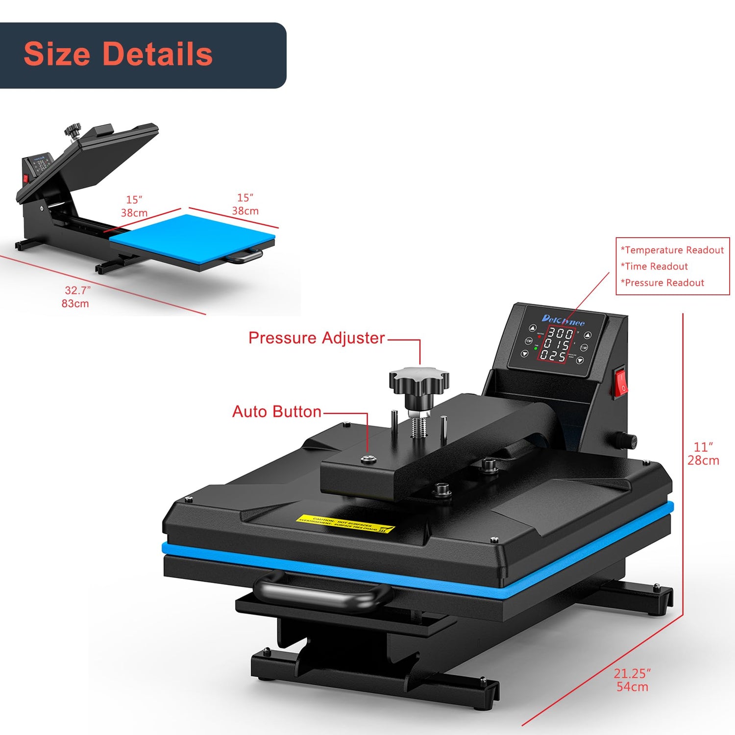 Delclynee Auto 15"x15" Heat Press Machine with Automatic Press and Release, Slide Out Lower Platen, Adjustable Pressure with Pressure Readout, Digital Industrial Clamshell Sublimation Printer (Black)