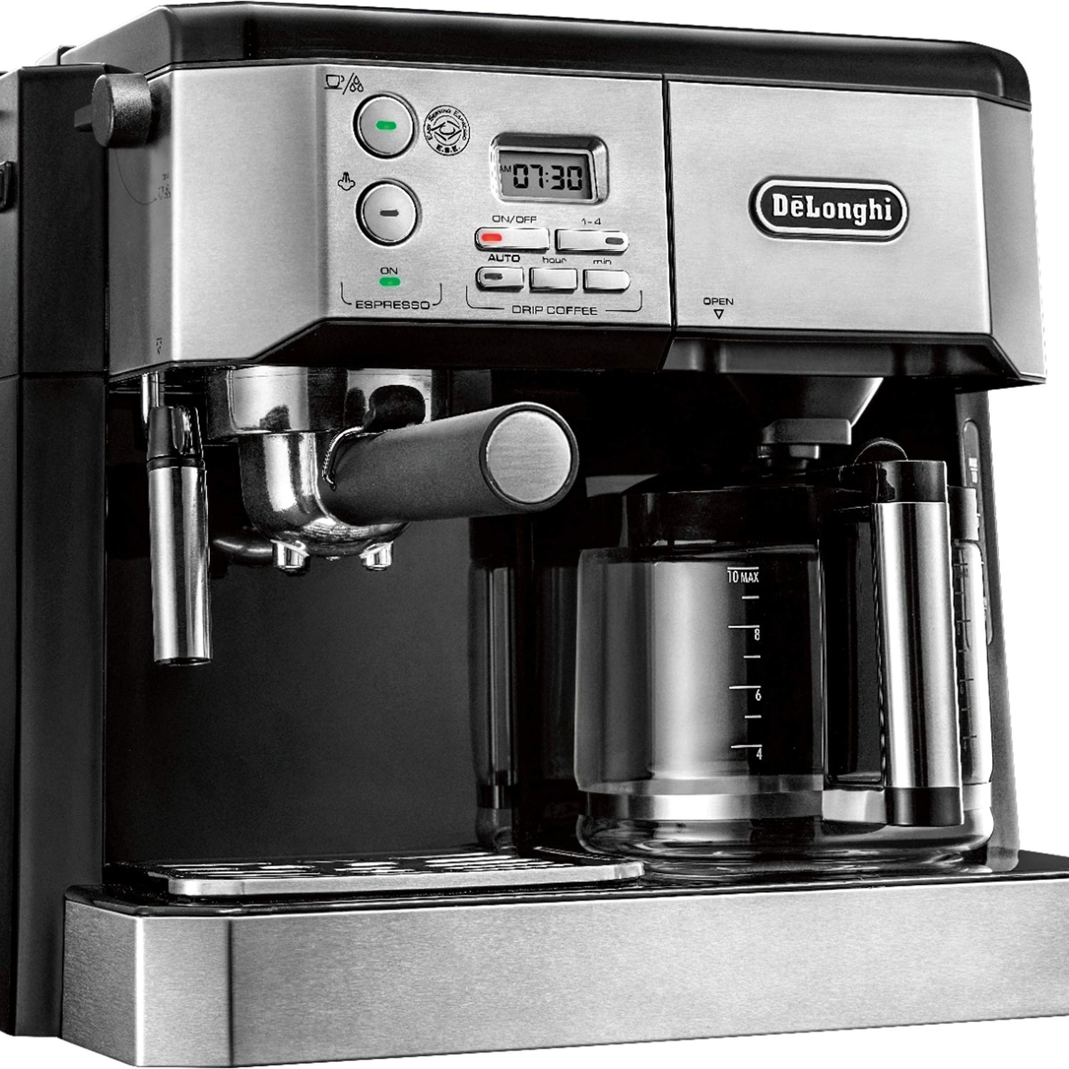 Details: For espresso and drip coffee lovers alike, the De'Longhi combination steam espresso/drip coffee machine, BCO430, offers the best of both worlds. This all-in-one machine prepares coffee, cappuccino, espresso and even lattes or hot chocolate to perfection using an innovative preparation system with simple steps for the at-home user. This new machine can brew two drinks at once, with a full cappuccino system on one side and a drip coffee machine on the other. The espresso is steam prepared, which means hot water is pushed through the coffee beans. This preparation delivers quality flavor every time. For drip coffee, it also features a frontal loading system, which allows you to load water and coffee from the front of the machine without having to move it from under the cabinet. The 24-hour programmable timer allows you to have a pot of coffee waiting for you when you want it. Experience the convenience and quality of this multitasking machine. The warm function keeps a whole pot of coffee warm for up to two hours.
