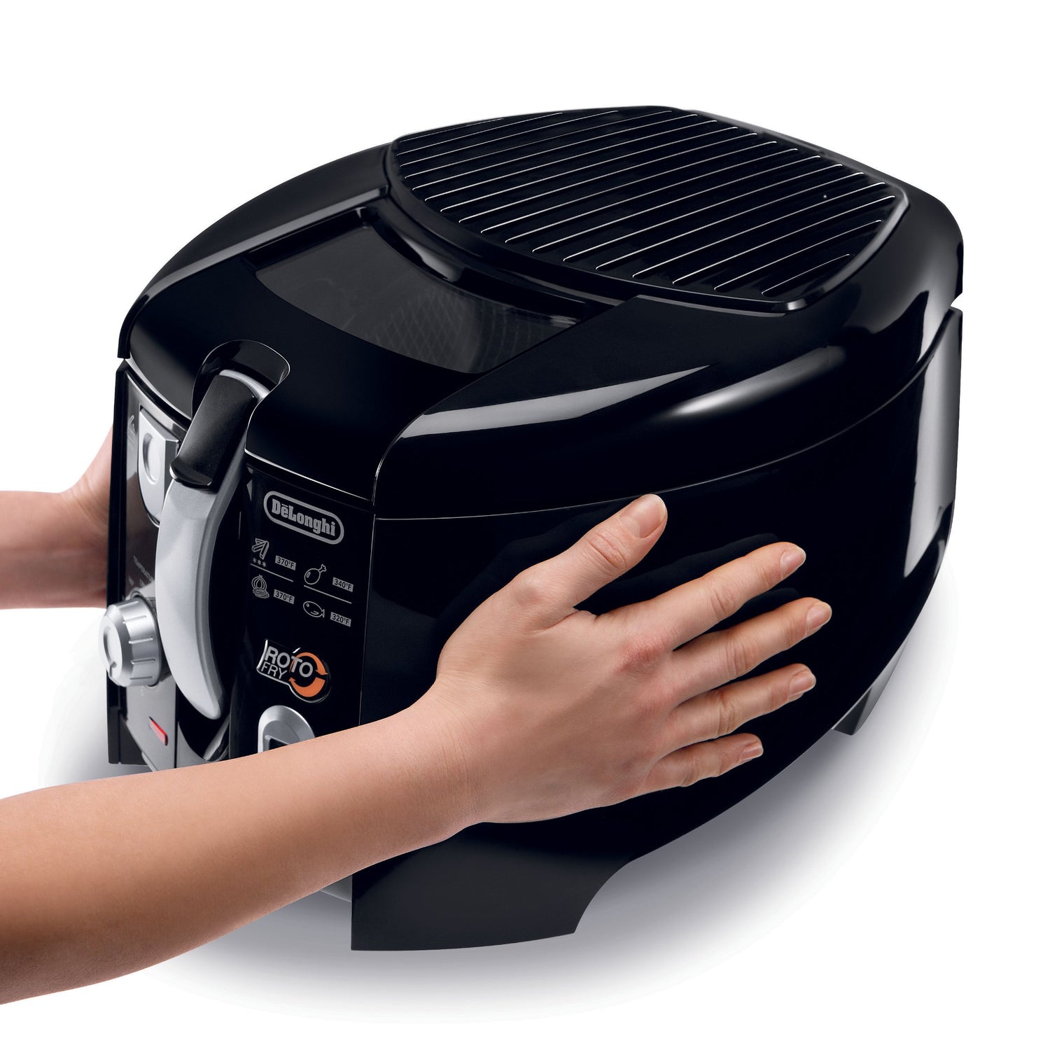 "Large 2.2 lb. Food capacity, rotating basket, easy clean oil drain system, non-stick interior, viewing window, adjustable thermostat, replaceable filter, digital timer, cool touch removable handle, detachable cord with patented condensation shield, black.Achieve crispier and healthier results with half the oil usage by using the DeLonghi Roto Deep Fryer. With a patented rotating basket, easy clean oil drain system, and dual filtration and replacement filters, cooking your favorite fried foods is easier than ever. Easy to clean with DeLonghi's patented oil drain system. View largerDual filters keep odor and oil vapors from lingering in kitchenRotating basket achivies crispier, healthier results. View largerRotating Basket Design The patented tilted rotating basket design lets you achieve crispier and healthier results, with only half the oil use of conventional fryers. Adjustable Thermostat Fry your favorite foods the way you like them with the digital adjustable thermostat with an indicator light. The temperature can be set between 300 and 370 degrees. Digital Timer Don't worry about over-frying; just set the built-in digital timer and the alarm will go off to remind you to check your food. Patented Easy Clean Oil Drain System No longer deal with messy, hot oil. Simply pull out the hose stored in the front of the fryer and drain the oil. Non-Stick Interior Enjoy quick and easy cleanup with the Roto Deep Fryer's non-stick interior. Magnetic, Detachable Cord Feel safe using the fryer with children or pets around with the detachable cord. The magnetic cord easily detaches from the fryer if accidentally pulled. Dual Filtration Replacement Filters Keep the odor and oil vapors from lingering in your kitchen with dual replaceable filters. Condensation Shield Prevent oil from dripping onto the cord connection with the patented condensation safety shield. Cool Touch Handle Monitor the cooking process safely with the windowed lid and cool-touch handle, which raises and lowers the basket while the fryer lid is closed.Technical SpecificationsFood Capacity: 2.2 lbs Oil Capacity: 1 liter Input Power: 1500 watts Control System: Digital control panel Basket: Circular, tilted rotating Filter: Dual filter, replaceable"