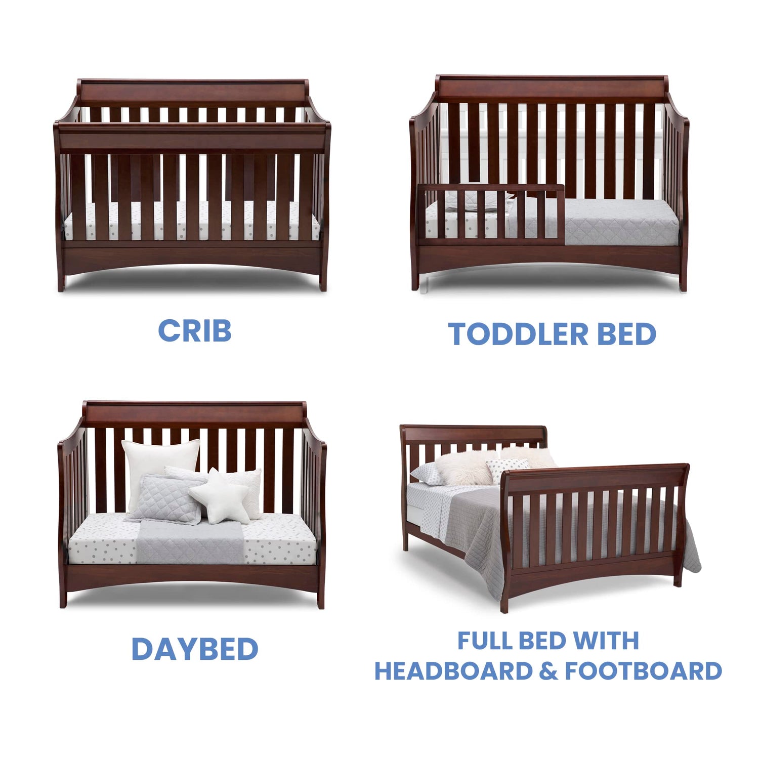 Details: Featuring a beautiful, understated sleigh silhouette, the Bentley 'S' Series 4-in-1 Crib from Delta Children delivers functionality and outstanding value for years to come. Made of solid hardwood, this multi-positional crib is built to handle anything your child throws its way and easily adapts to a cozy toddler bed, daybed and full size bed (Toddler Guardrail and Crib Conversion Rails sold separately).