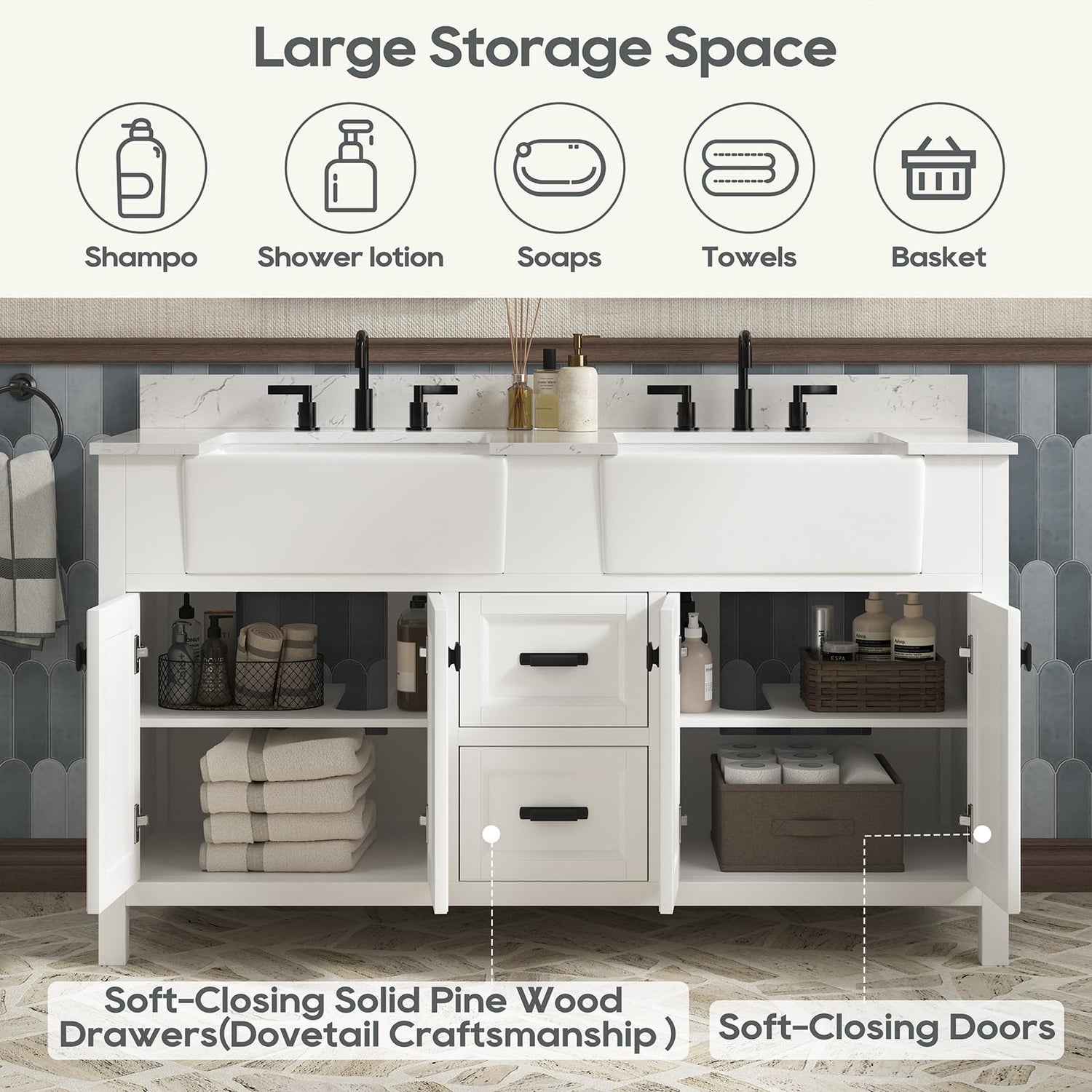 - Spacious Storage - The 60 inch white vanity with sink features 4 soft-closing doors and 2 soft-closing drawers, offering ample space for toiletries, towels, and essentials while keeping the space tidy and clutter-free.
