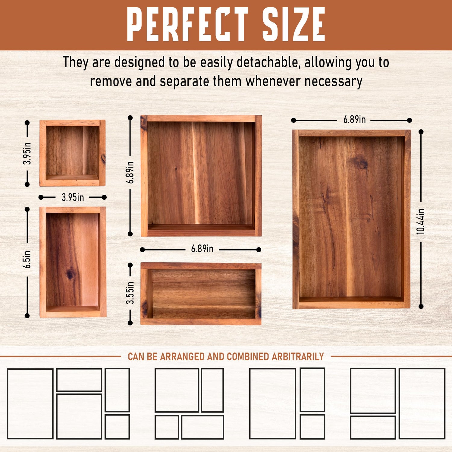 - Different Sizes for Utensil Organizer: The cabinet drawer includes 5 small drawer organizers, each available in different sizes. The compact dimensions of 3.95 x 3.95", 3.95 x 6.5", 3.55 x 6.89", 6.89 x 6.89", and 6.89 x 10.44" make them convenient for use as a vanity organizer, catering to your personal needs. Our wooden boxes can be rearranged to your preference, allowing you to organize these storage bins individually or as a set. Feel free to mix and match the inserts to perfectly suit your spaces.