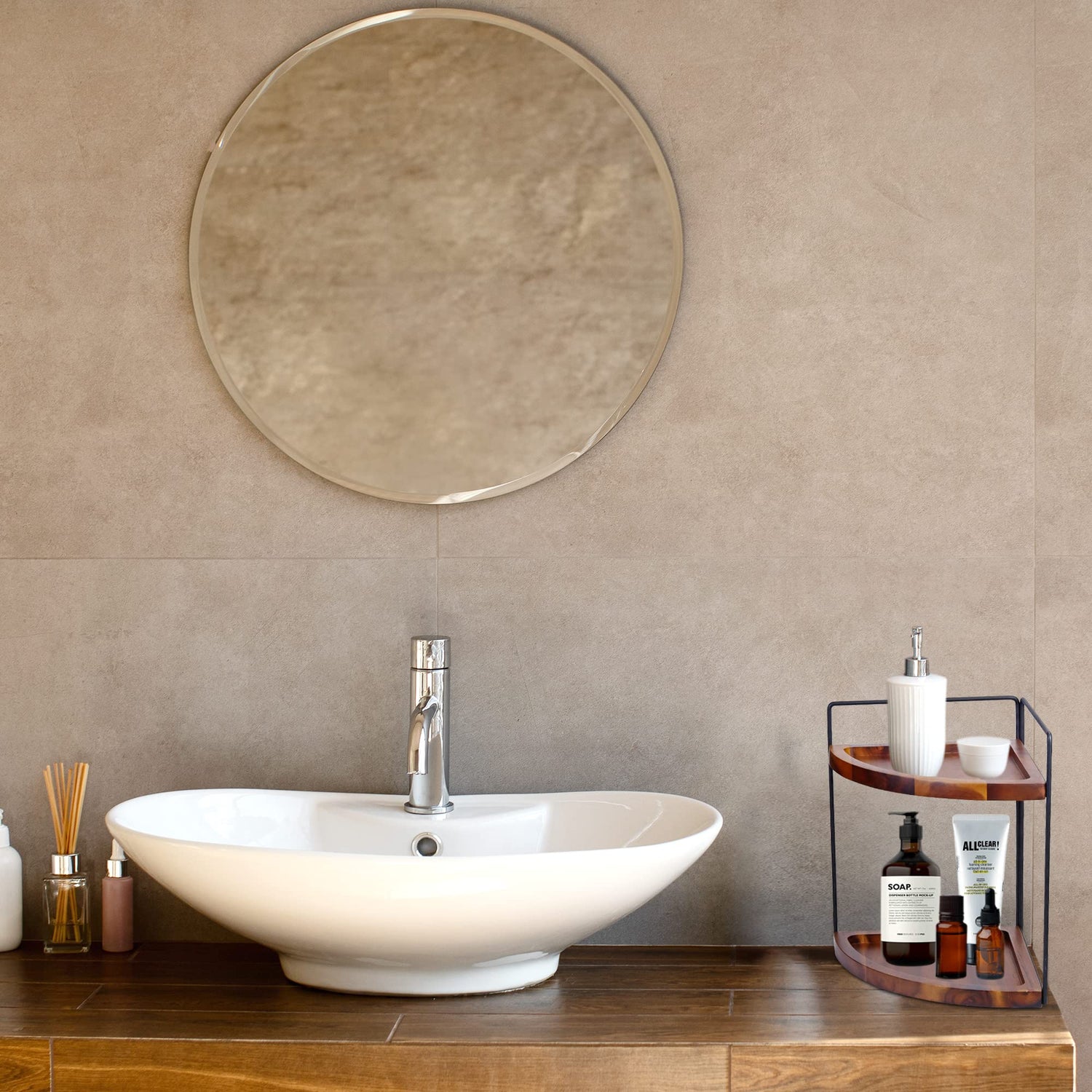 Demigo 2-Tier Acacia Wood Corner Counter Organizer - Elegant Storage Solution for Bathroom, Kitchen, and Vanity