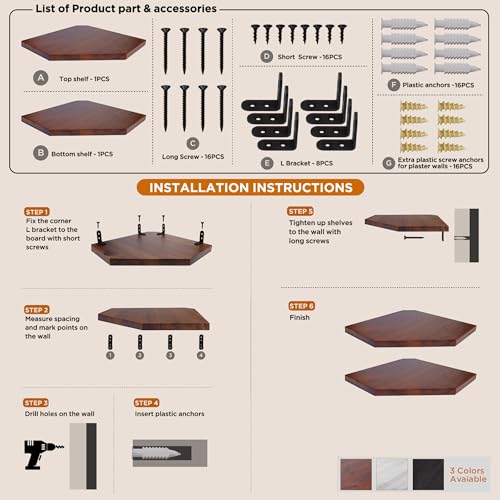 - Easy To Mount: We've made mounting our corner floating shelf an effortless task for you. The package includes all the hardware needed for installation, and the instructions are detailed, ensuring a seamless assembly process. Please keep in mind that this shelf is specifically designed to fit 90-degree wall corners, guaranteeing a stable and secure installation.